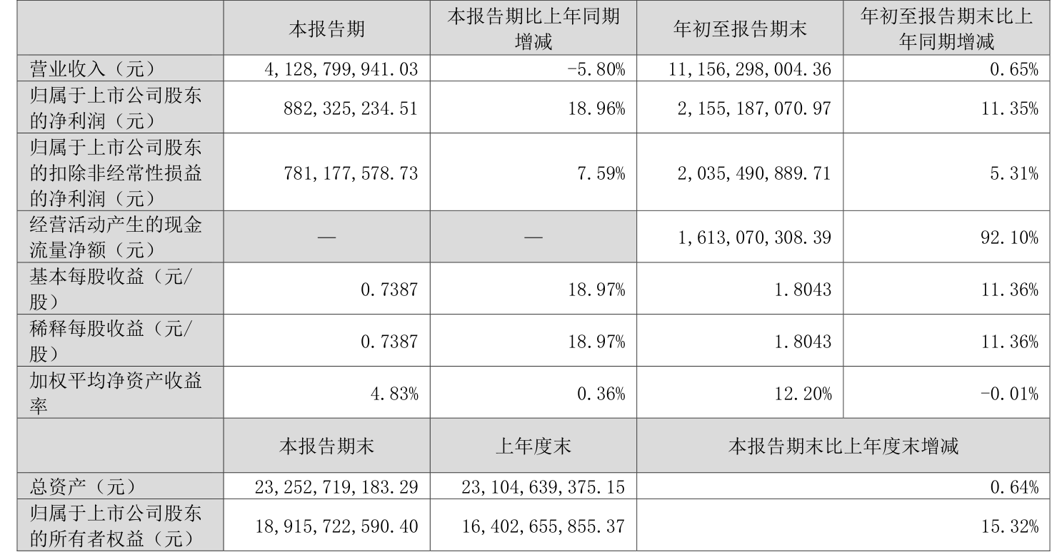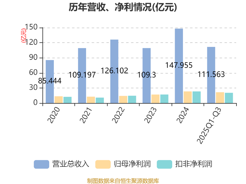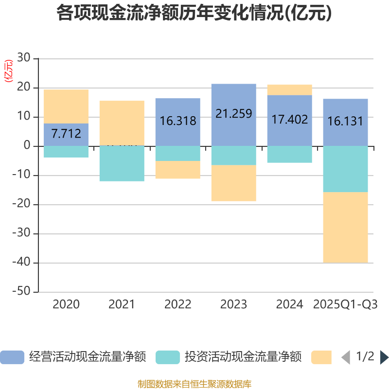 2025年前三季度,公司经营活动现金流净额为16.13亿元,同比增长92.1%;筹资活动现金流净额-24.14亿元,同比减少31.81亿元;投资活动现金流净额-15.87亿元,上年同期为-4.47亿元。