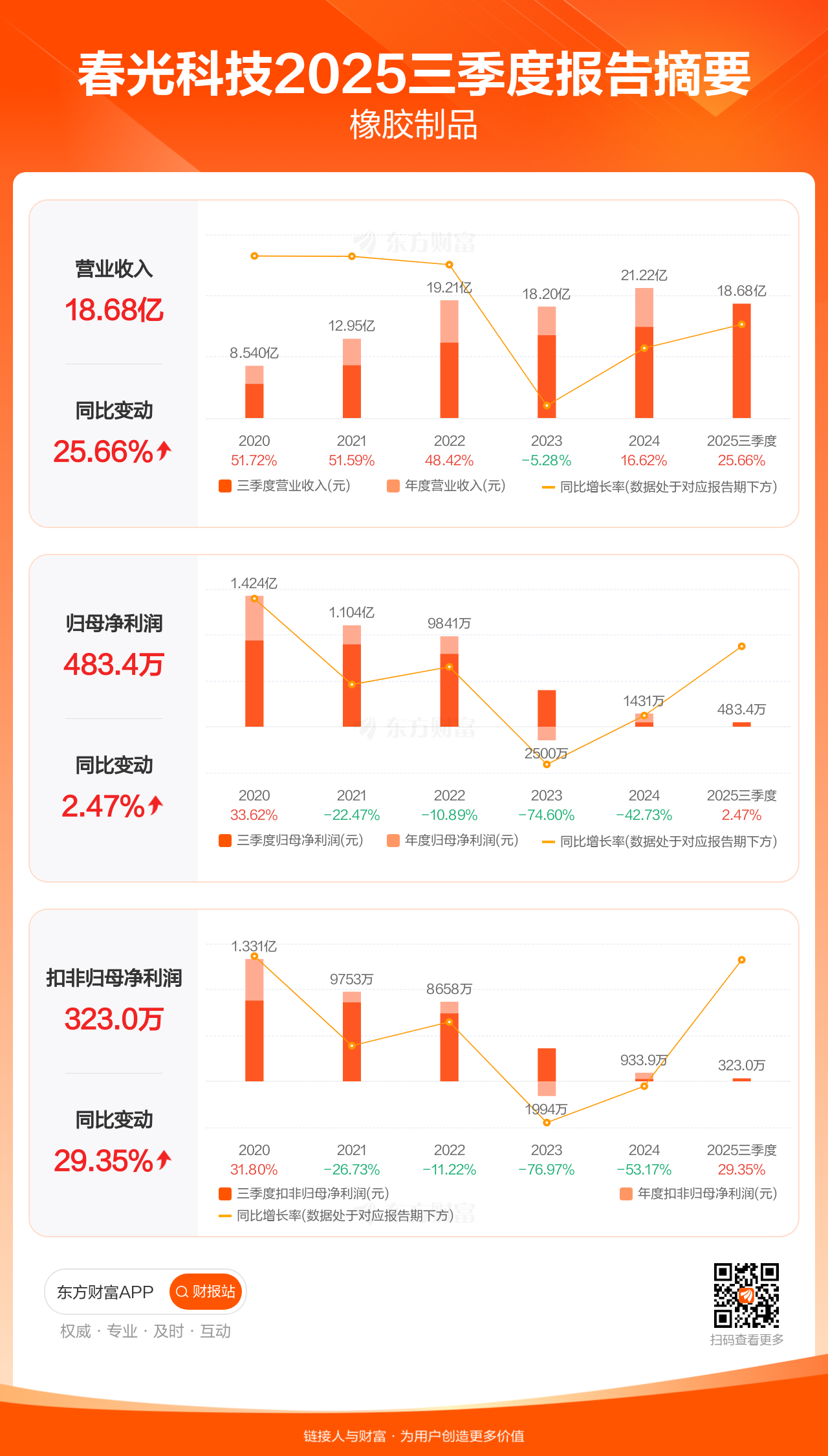 春光科技10月31日发布2025年三季报显示,公司前三季实现营业收入18.68亿元,同比增长25.66%;归母净利润483.35万元,同比增长2.47%;扣非归母净利润323.01万元,同比增长29.35%。