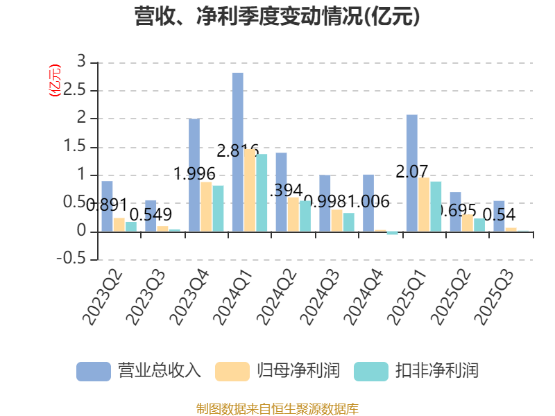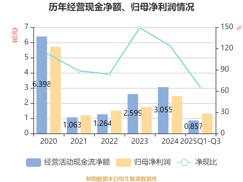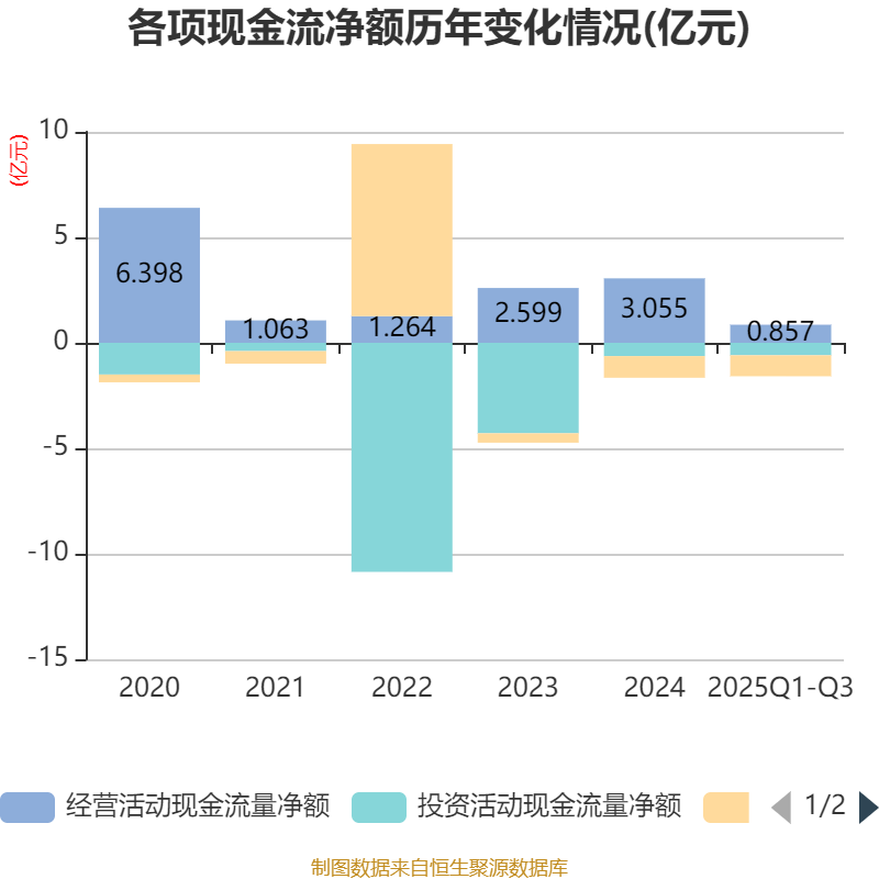 2025年前三季度,公司经营活动现金流净额为8567.38万元,同比下降60%;筹资活动现金流净额-9946.85万元,同比减少4695.56万元;投资活动现金流净额-5910.6万元,上年同期为2.17亿元。