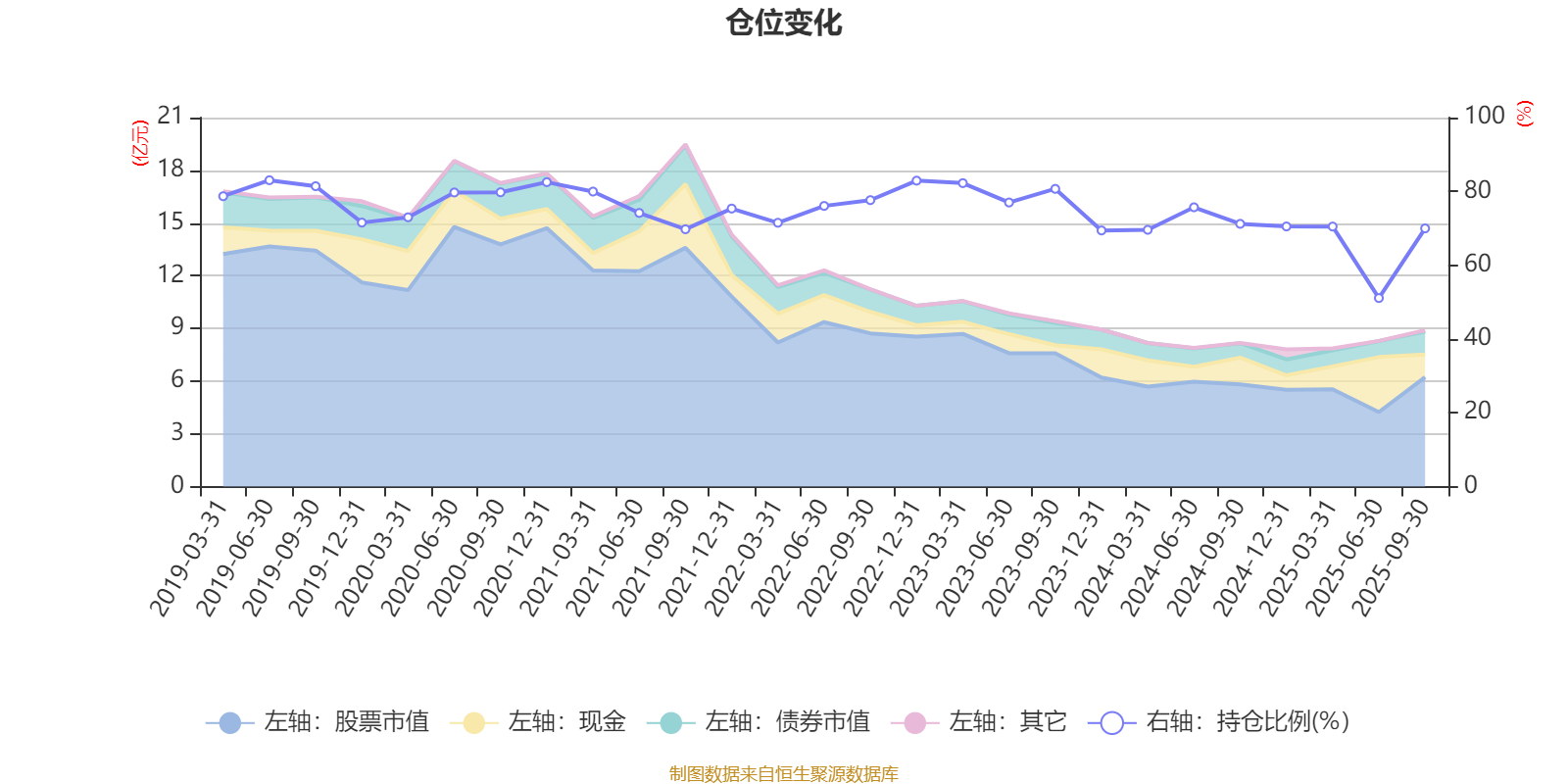 据定期报告数据统计,近三年平均股票仓位为72.56%,同类平均为72.35%。2019年上半年末基金达到83.03%的最高仓位,2025年上半年末最低,为51.09%。
