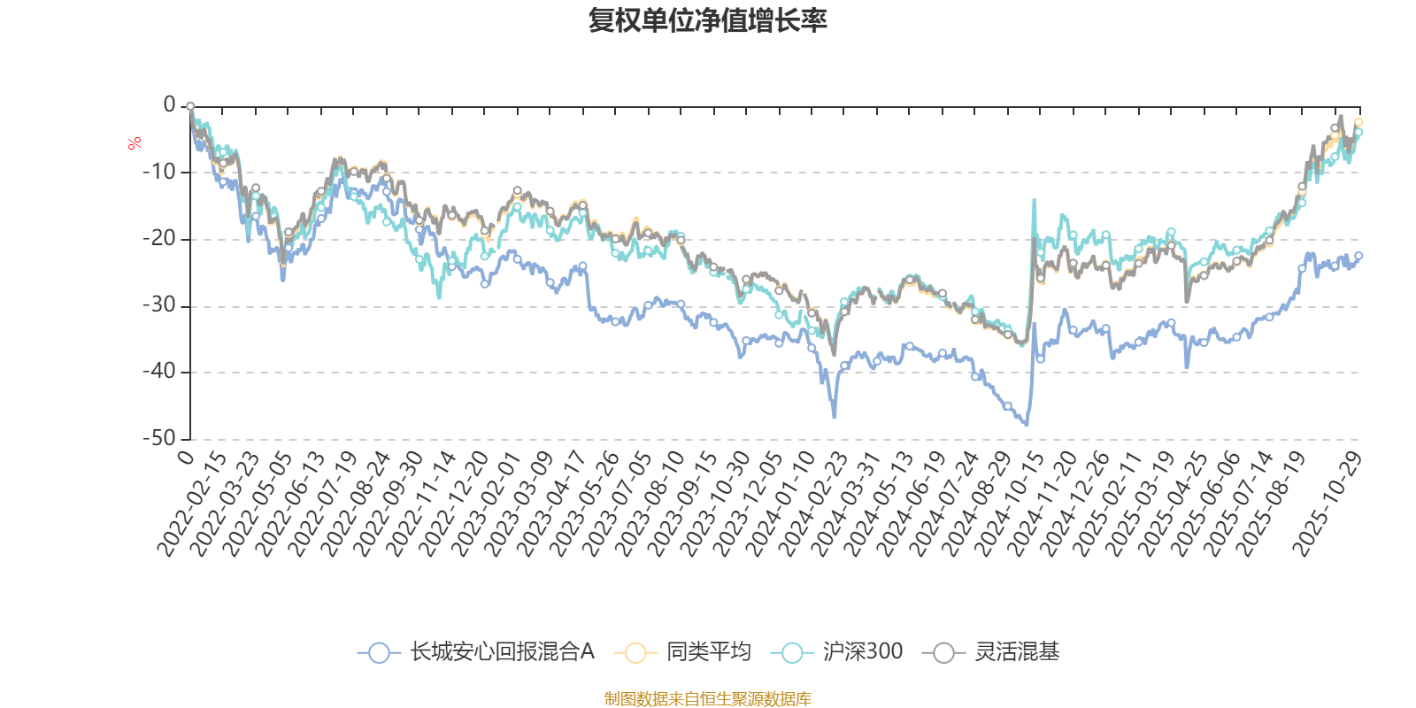 截至10月29日,长城安心回报混合A近三个月复权单位净值增长率为10.33%,位于同类可比基金730/1287;近半年复权单位净值增长率为19.93%,位于同类可比基金794/1287;近一年复权单位净值增长率为20.41%,位于同类可比基金732/1287;近三年复权单位净值增长率为-0.10%,位于同类可比基金1040/1286。