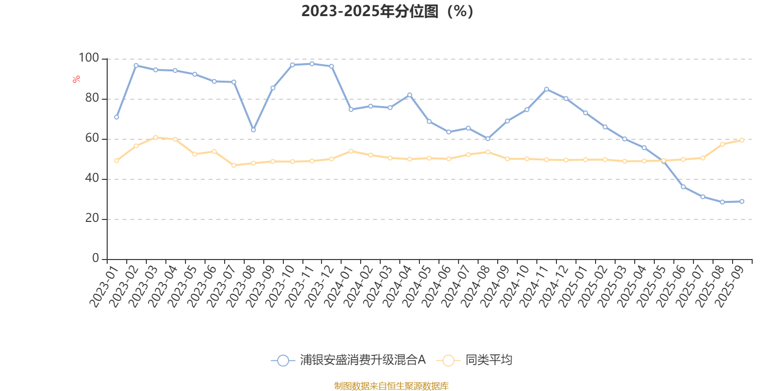 通过所选区间该基金净值增长率分位图,可以观察该基金与同类基金业绩比较情况。图为坐标原点到区间内某时点的净值增长率在同类基金中的分位数。