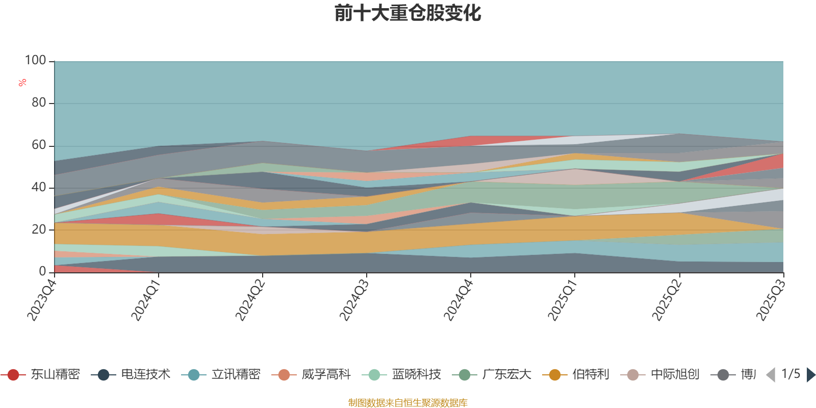 该基金持股集中度较高。截至2025年三季度末,基金十大重仓股分别是立讯精密、博威合金、英维克、广东宏大、振华股份、双环传动、杰瑞股份、思特威、电连技术、铂科新材。