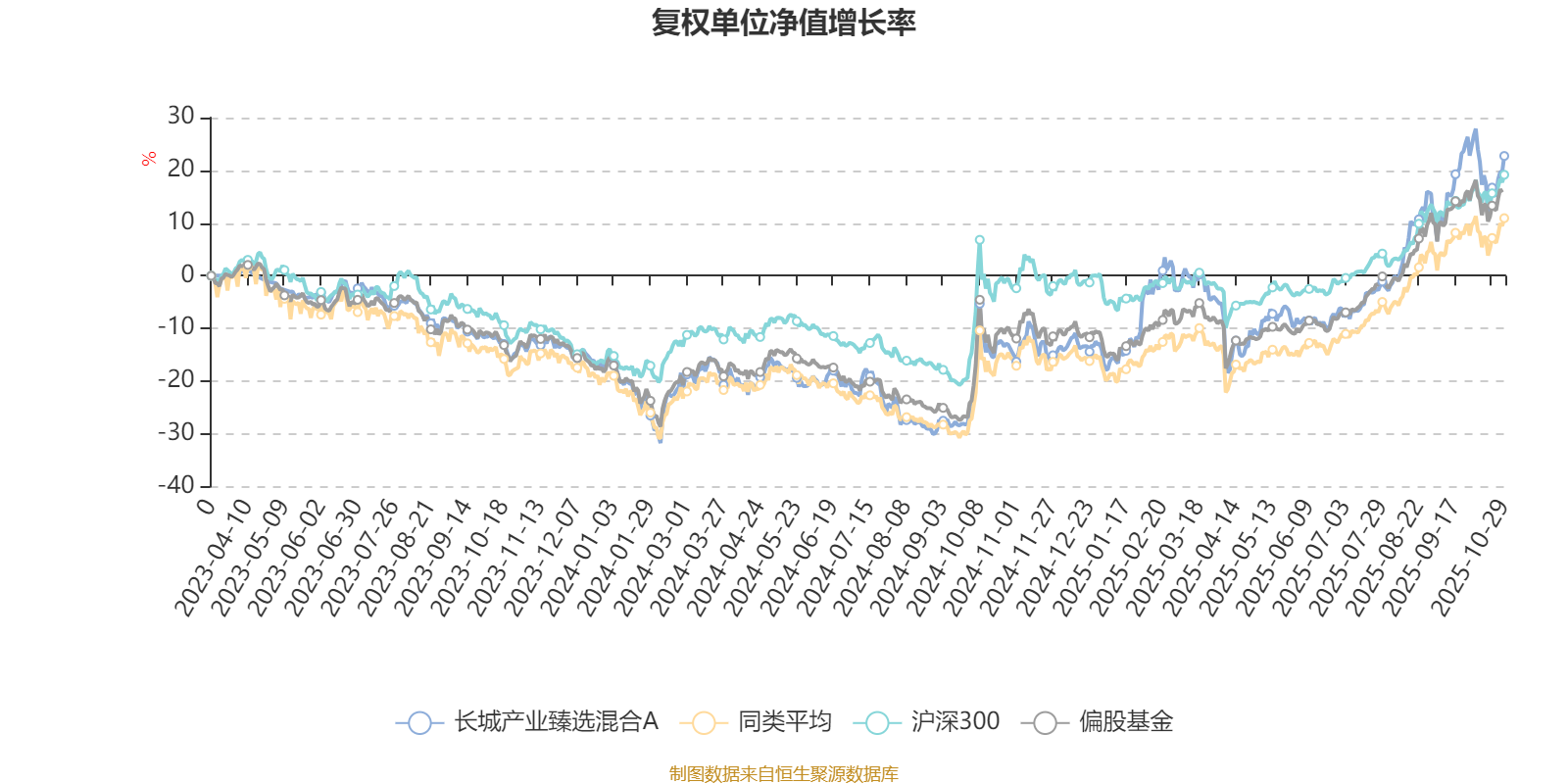截至10月29日,长城产业臻选混合A近三个月复权单位净值增长率为24.09%,位于同类可比基金135/621;近半年复权单位净值增长率为38.09%,位于同类可比基金190/621;近一年复权单位净值增长率为42.37%,位于同类可比基金169/611。