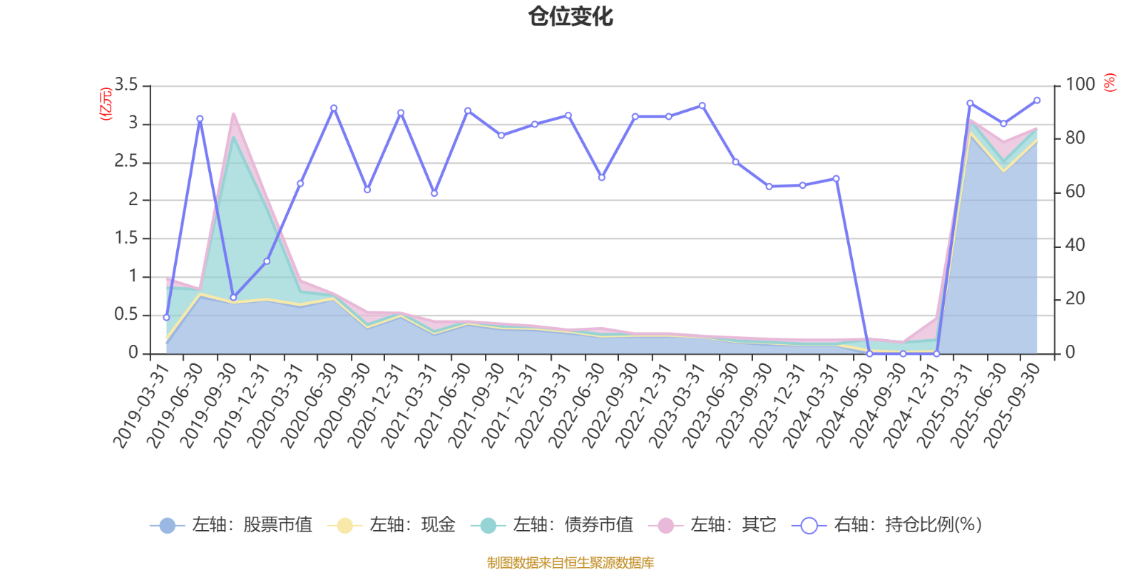 据定期报告数据统计,近三年平均股票仓位为59.72%,同类平均为72.35%。2025年三季度末基金达到94.49%的最高仓位,2019年一季度末最低,为13.53%。