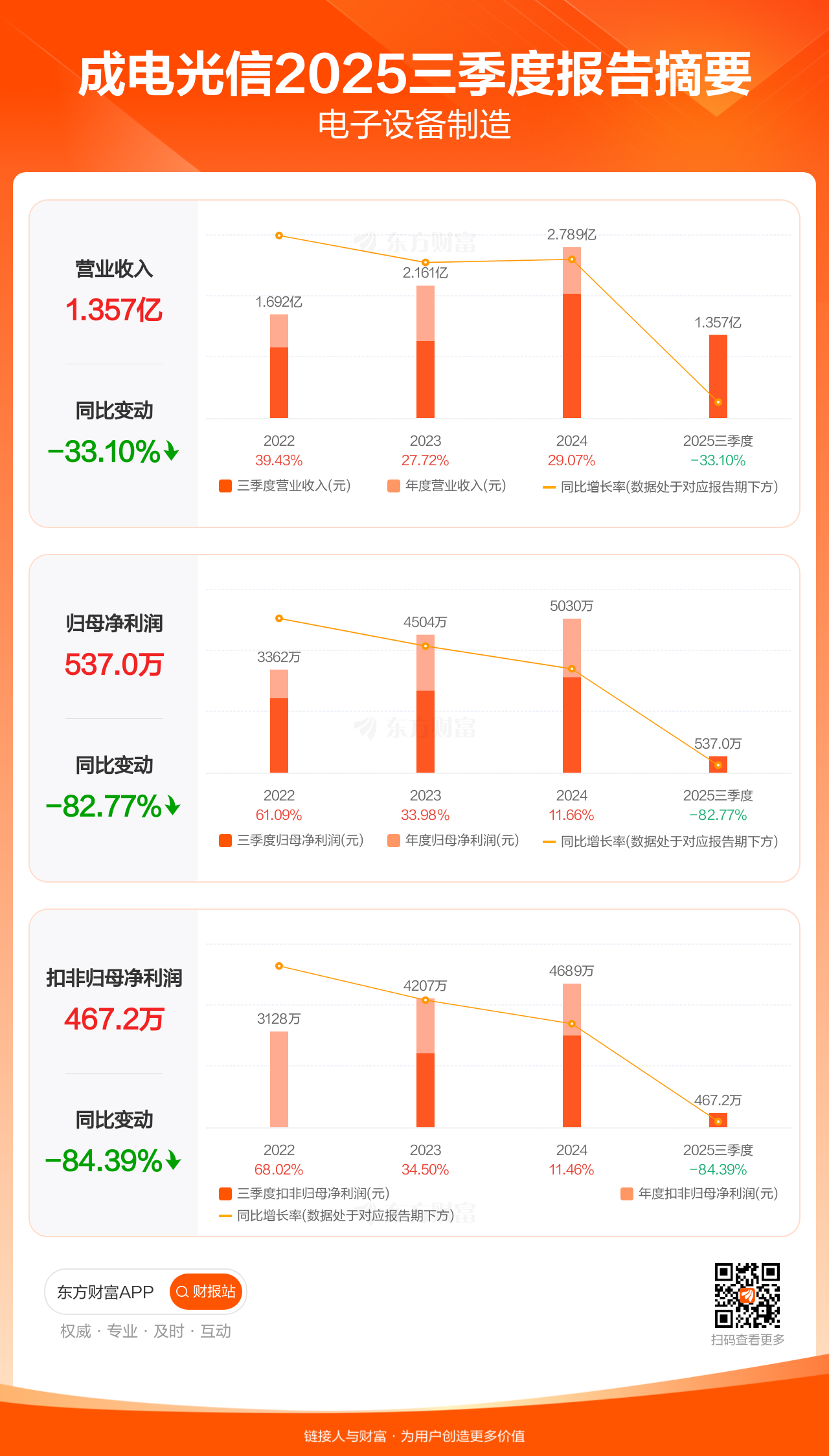成电光信10月30日发布2025年三季报显示,公司前三季实现营业收入1.36亿元,同比下滑33.10%;归母净利润537.02万元,同比下滑82.77%;扣非归母净利润467.19万元,同比下滑84.39%。