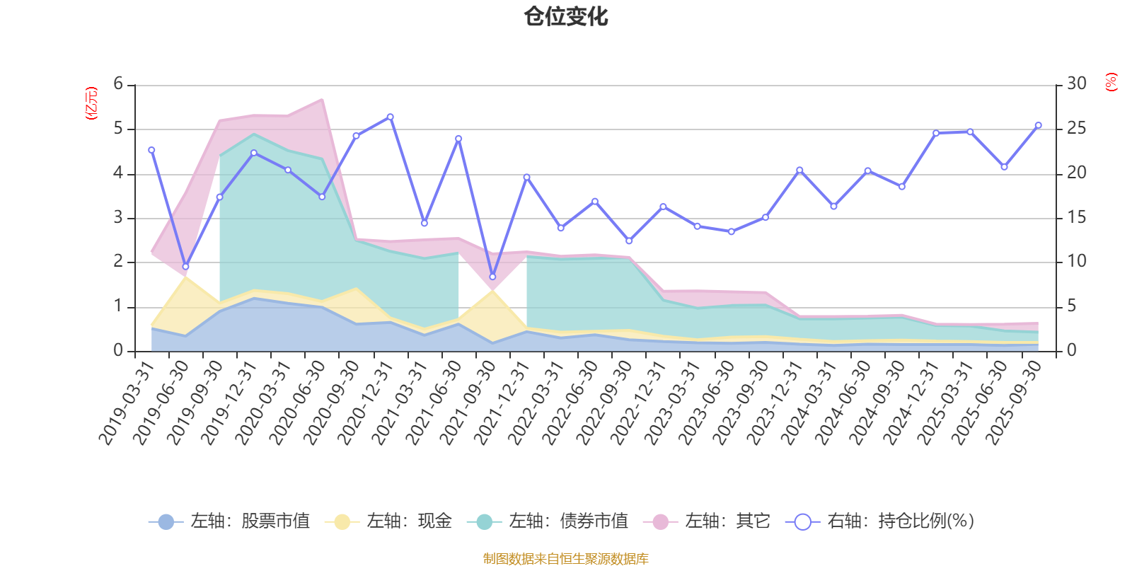 据定期报告数据统计,近三年平均股票仓位为19.17%,同类平均为19.14%。2020年末基金达到26.4%的最高仓位,2021年三季度末最低,为8.39%。