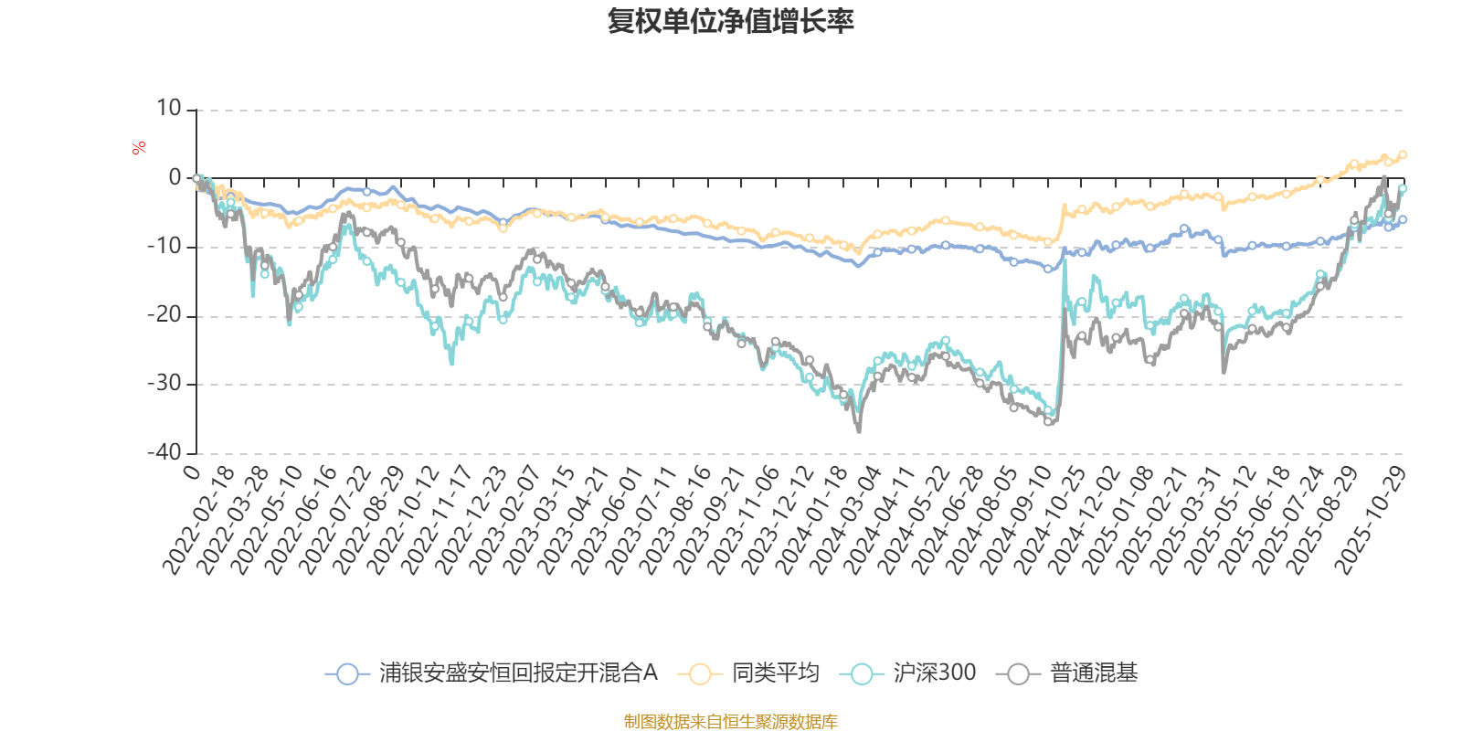 截至10月29日,浦银安盛安恒回报定开混合A近三个月复权单位净值增长率为3.46%,位于同类可比基金223/629;近半年复权单位净值增长率为4.93%,位于同类可比基金355/629;近一年复权单位净值增长率为5.57%,位于同类可比基金448/623;近三年复权单位净值增长率为-1.09%,位于同类可比基金537/557。