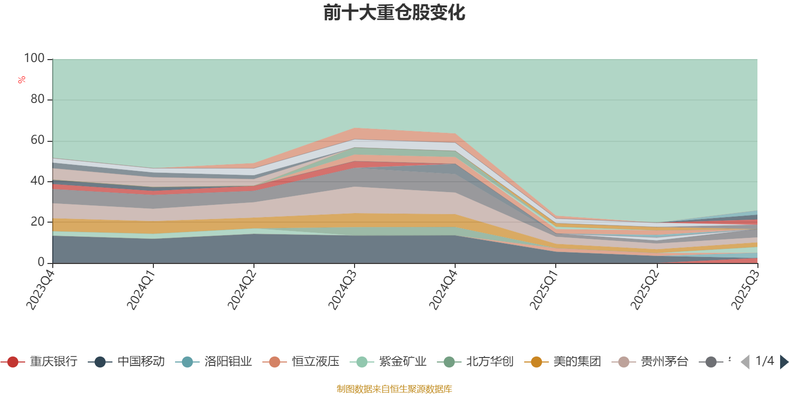 截至2025年三季度末,基金十大重仓股分别是宁德时代、紫金矿业、东鹏饮料、洛阳钼业、贵州茅台、重庆银行、华友钴业、美的集团、先导智能、中远海特。