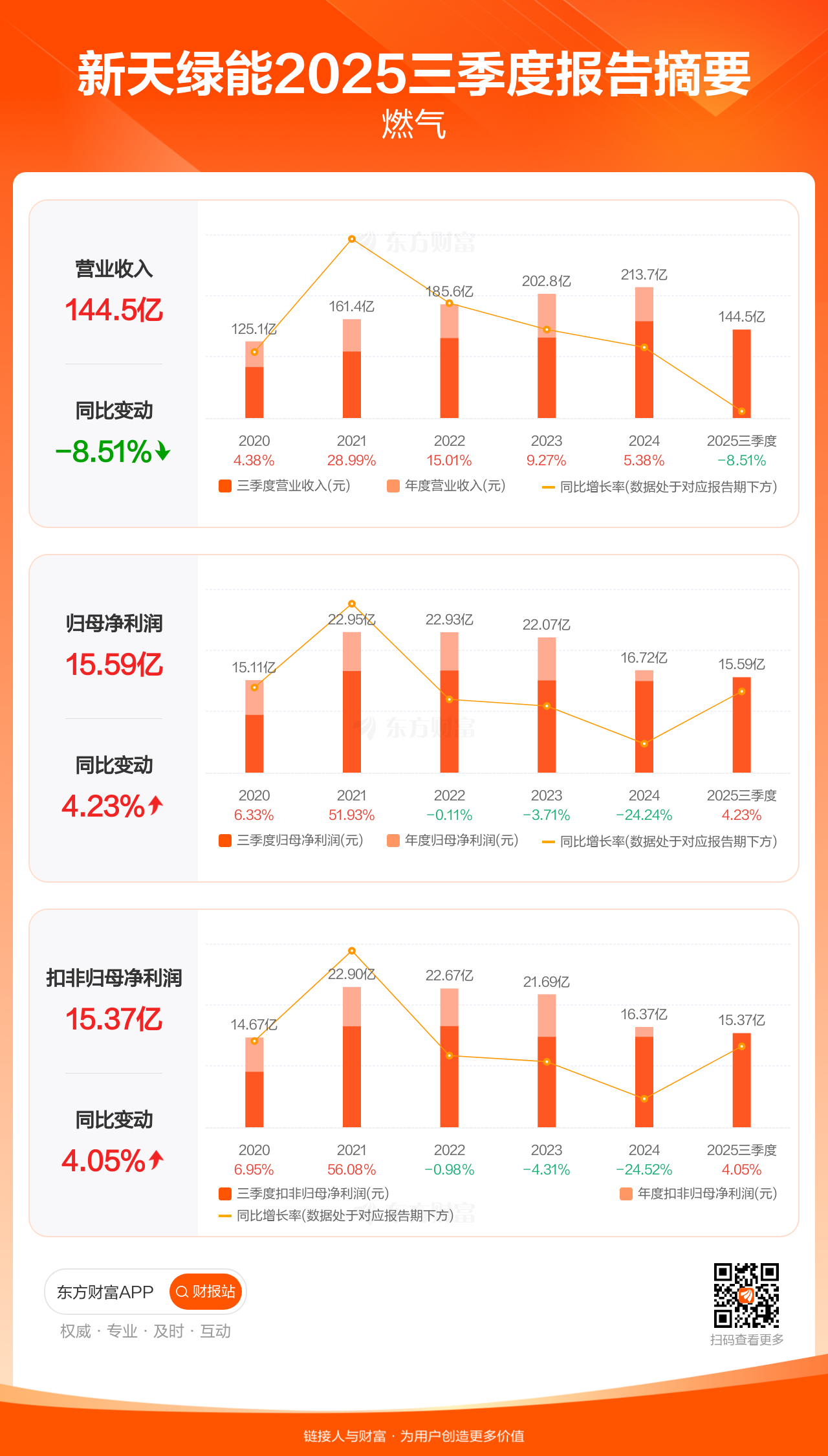 新天绿能10月31日发布2025年三季报显示,公司前三季实现营业收入144.45亿元,同比下滑8.51%;归母净利润15.59亿元,同比增长4.23%;扣非归母净利润15.37亿元,同比增长4.05%。