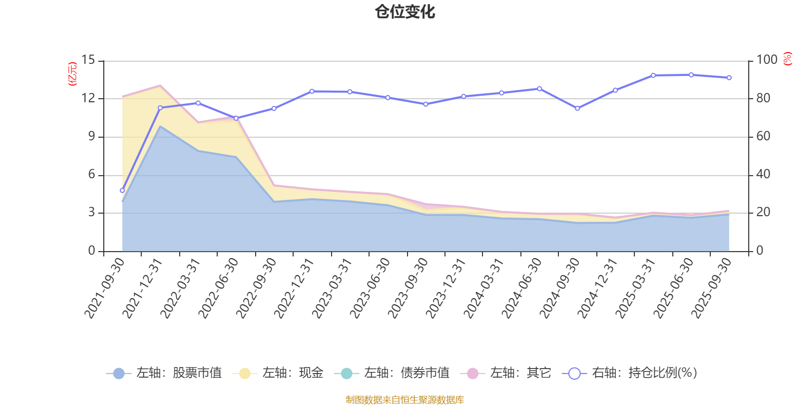 据定期报告数据统计,近三年平均股票仓位为84.25%,同类平均为85.66%。2025年上半年末基金达到92.61%的最高仓位,2021年三季度末最低,为31.98%。