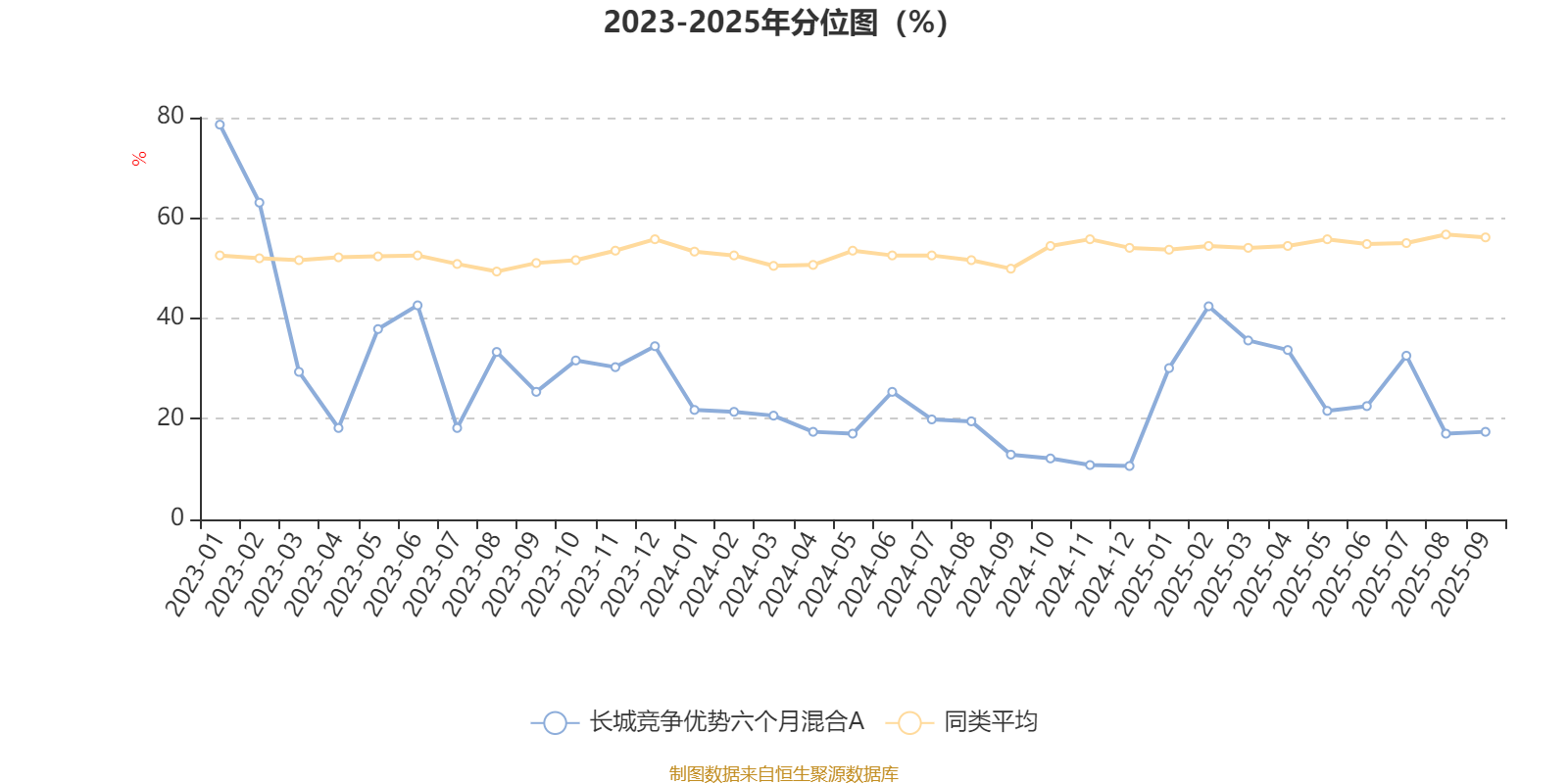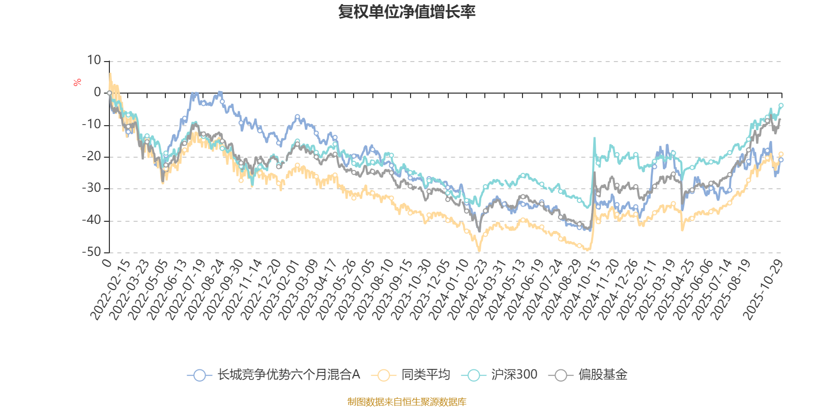 截至10月29日,长城竞争优势六个月混合A近三个月复权单位净值增长率为1.01%,位于同类可比基金587/621;近半年复权单位净值增长率为13.28%,位于同类可比基金543/621;近一年复权单位净值增长率为21.50%,位于同类可比基金422/611;近三年复权单位净值增长率为-10.87%,位于同类可比基金480/518。