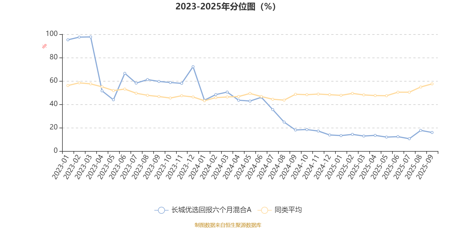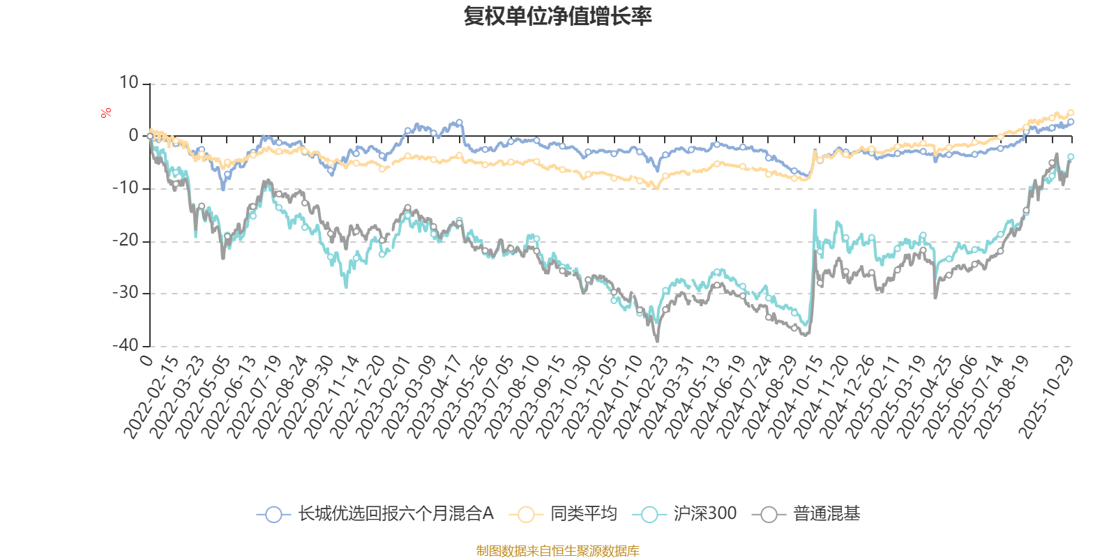 截至10月29日,长城优选回报六个月混合A近三个月复权单位净值增长率为4.36%,位于同类可比基金153/629;近半年复权单位净值增长率为6.54%,位于同类可比基金249/629;近一年复权单位净值增长率为6.72%,位于同类可比基金372/623;近三年复权单位净值增长率为8.23%,位于同类可比基金411/557。