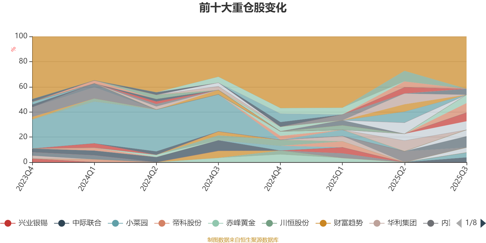 截至2025年三季度末,基金十大重仓股分别是广发证券、东吴证券、指南针、国元证券、中集车辆、良信股份、华立科技、兴业证券、小菜园、中际联合。