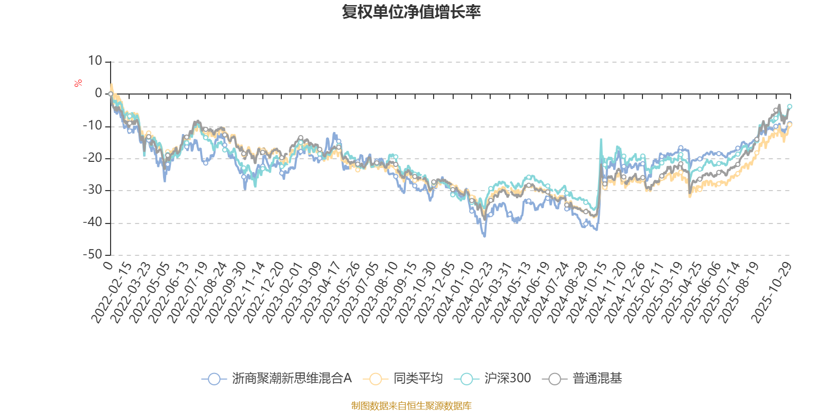 截至10月29日,浙商聚潮新思维混合A近三个月复权单位净值增长率为7.51%,位于同类可比基金92/134;近半年复权单位净值增长率为14.19%,位于同类可比基金93/134;近一年复权单位净值增长率为16.84%,位于同类可比基金82/130;近三年复权单位净值增长率为25.84%,位于同类可比基金46/119。