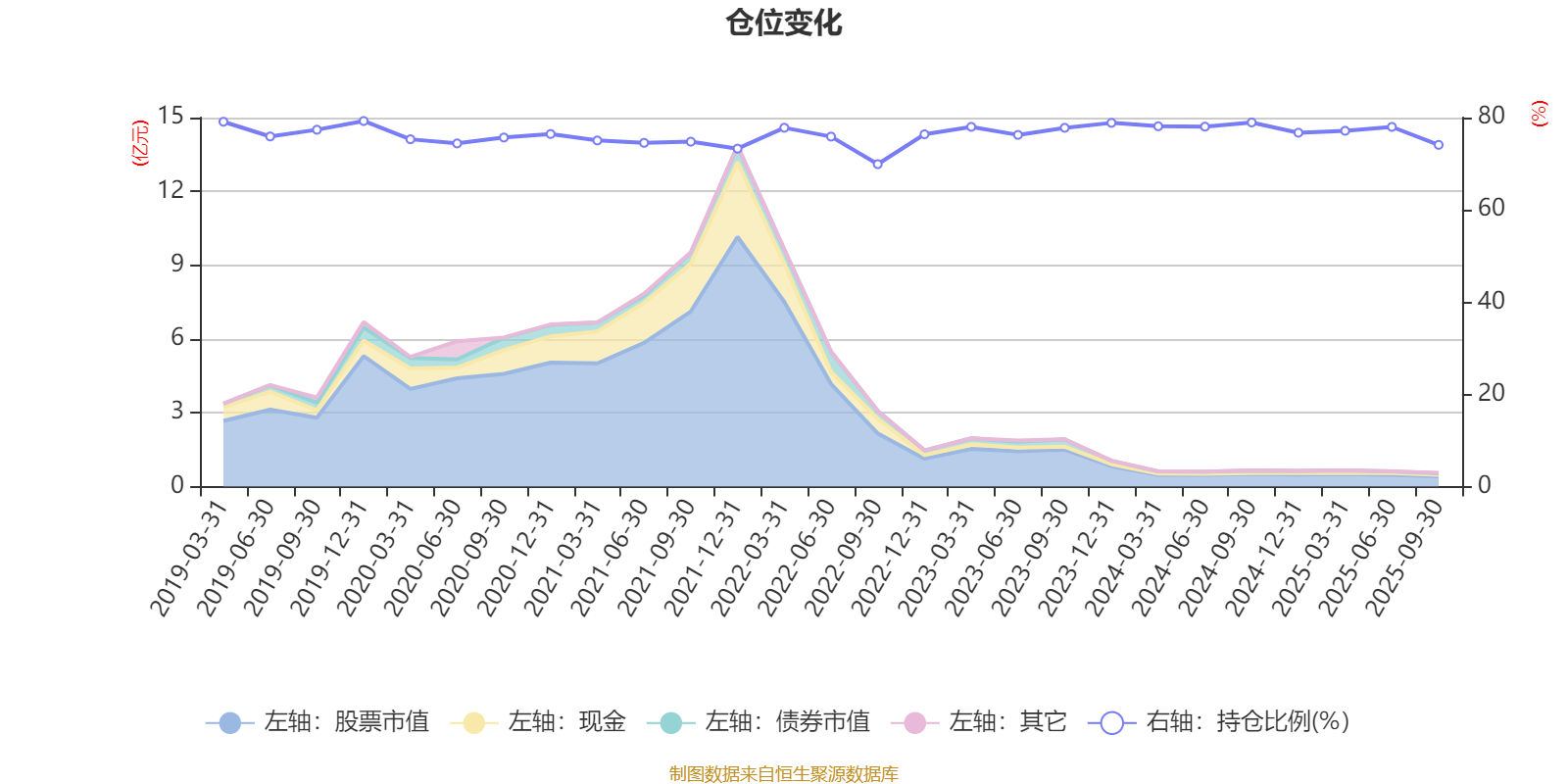 据定期报告数据统计,近三年平均股票仓位为77.36%,同类平均为67.37%。2019年末基金达到79.26%的最高仓位,2022年三季度末最低,为69.9%。