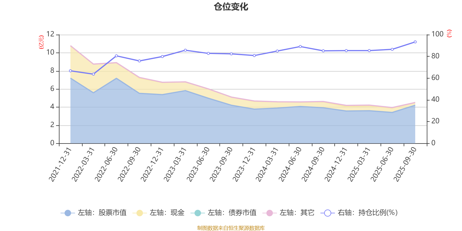 据定期报告数据统计,近三年平均股票仓位为85.08%,同类平均为85.66%。2025年三季度末基金达到93.33%的最高仓位,2022年一季度末最低,为63.7%。