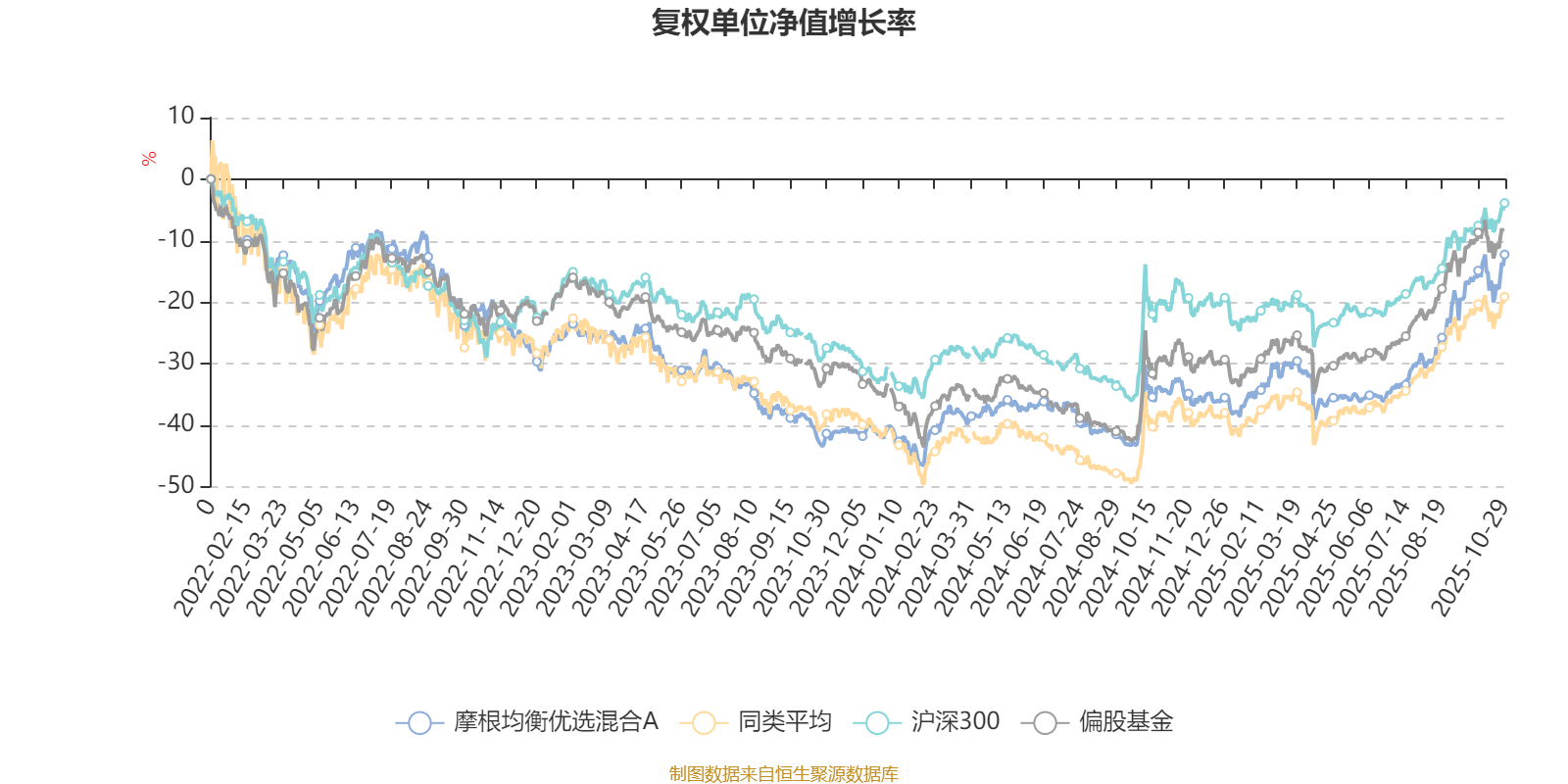 截至10月29日,摩根均衡优选混合A近三个月复权单位净值增长率为22.41%,位于同类可比基金160/621;近半年复权单位净值增长率为36.70%,位于同类可比基金206/621;近一年复权单位净值增长率为33.66%,位于同类可比基金270/611;近三年复权单位净值增长率为13.99%,位于同类可比基金300/518。