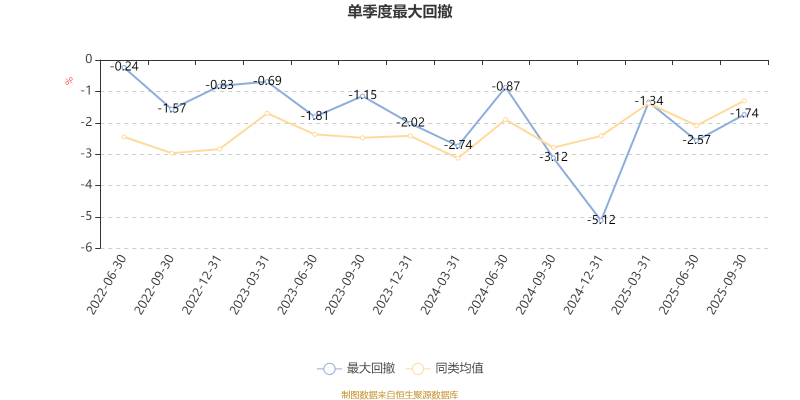 截至10月29日,基金近三年最大回撤为5.12%,同类可比基金排名199/534。单季度最大回撤出现在2024年四季度,为5.12%。
