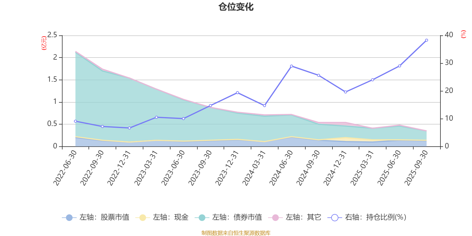 据定期报告数据统计,近三年平均股票仓位为20.13%,同类平均为19.14%。2025年三季度末基金达到38.28%的最高仓位,2022年末最低,为6.66%。