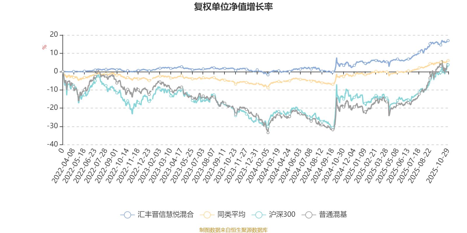 截至10月29日,汇丰晋信慧悦混合近三个月复权单位净值增长率为4.59%,位于同类可比基金139/629;近半年复权单位净值增长率为9.73%,位于同类可比基金116/629;近一年复权单位净值增长率为12.71%,位于同类可比基金86/623;近三年复权单位净值增长率为17.14%,位于同类可比基金142/557。
