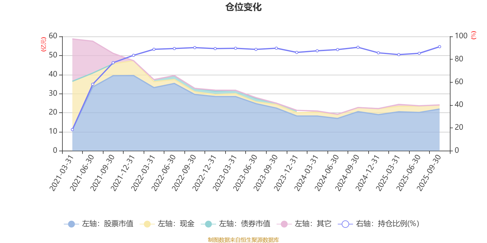 据定期报告数据统计,近三年平均股票仓位为88.01%,同类平均为86.15%。2025年三季度末基金达到91.04%的最高仓位,2021年一季度末最低,为18.54%。