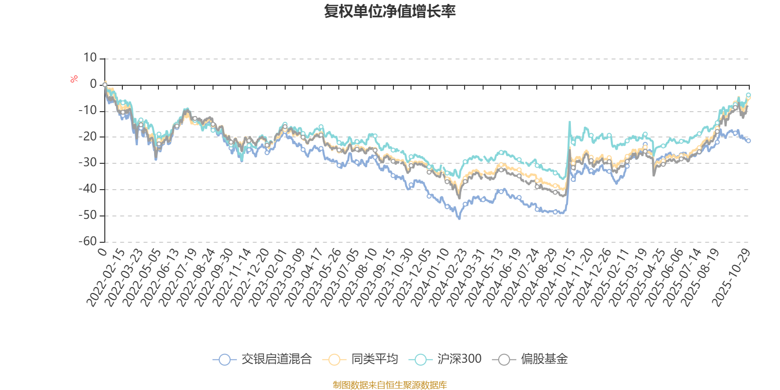 截至10月29日,交银启道混合近三个月复权单位净值增长率为2.16%,位于同类可比基金119/130;近半年复权单位净值增长率为8.76%,位于同类可比基金120/130;近一年复权单位净值增长率为17.90%,位于同类可比基金97/130;近三年复权单位净值增长率为10.97%,位于同类可比基金93/124。