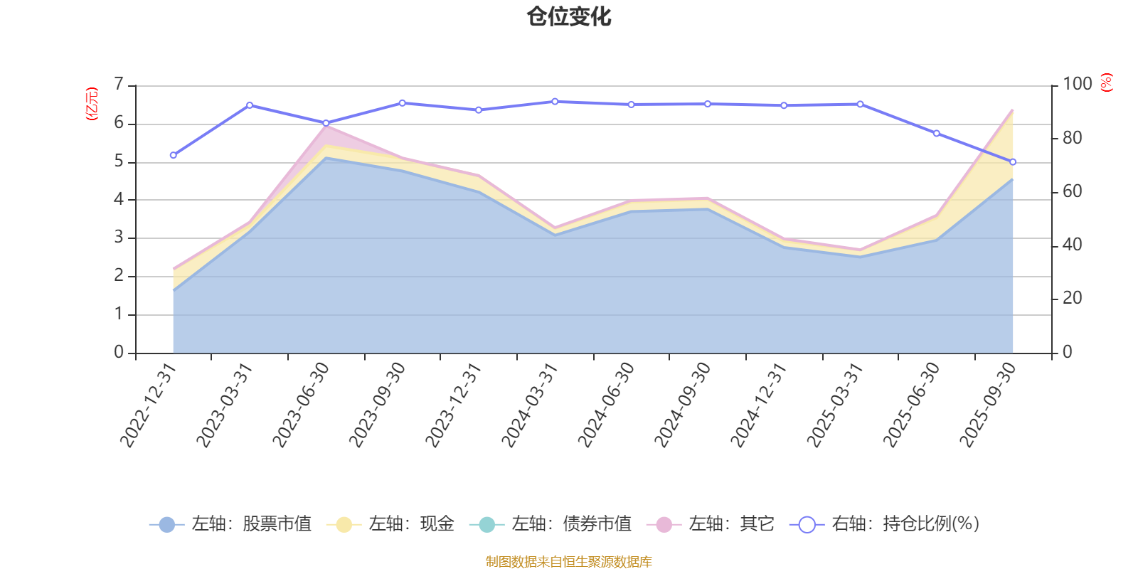 据定期报告数据统计,近三年平均股票仓位为87.96%,同类平均为85.66%。2024年一季度末基金达到93.99%的最高仓位,2025年三季度末最低,为71.41%。