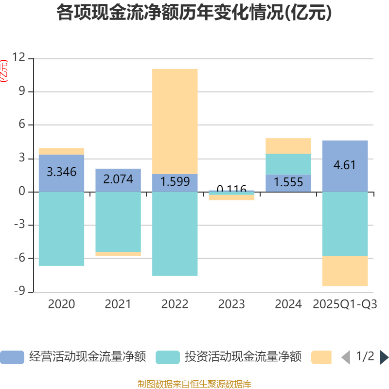 2025年前三季度,公司经营活动现金流净额为4.61亿元,同比增长371.99%;筹资活动现金流净额-2.7亿元,同比减少2.7亿元;投资活动现金流净额-5.79亿元,上年同期为2.33亿元。