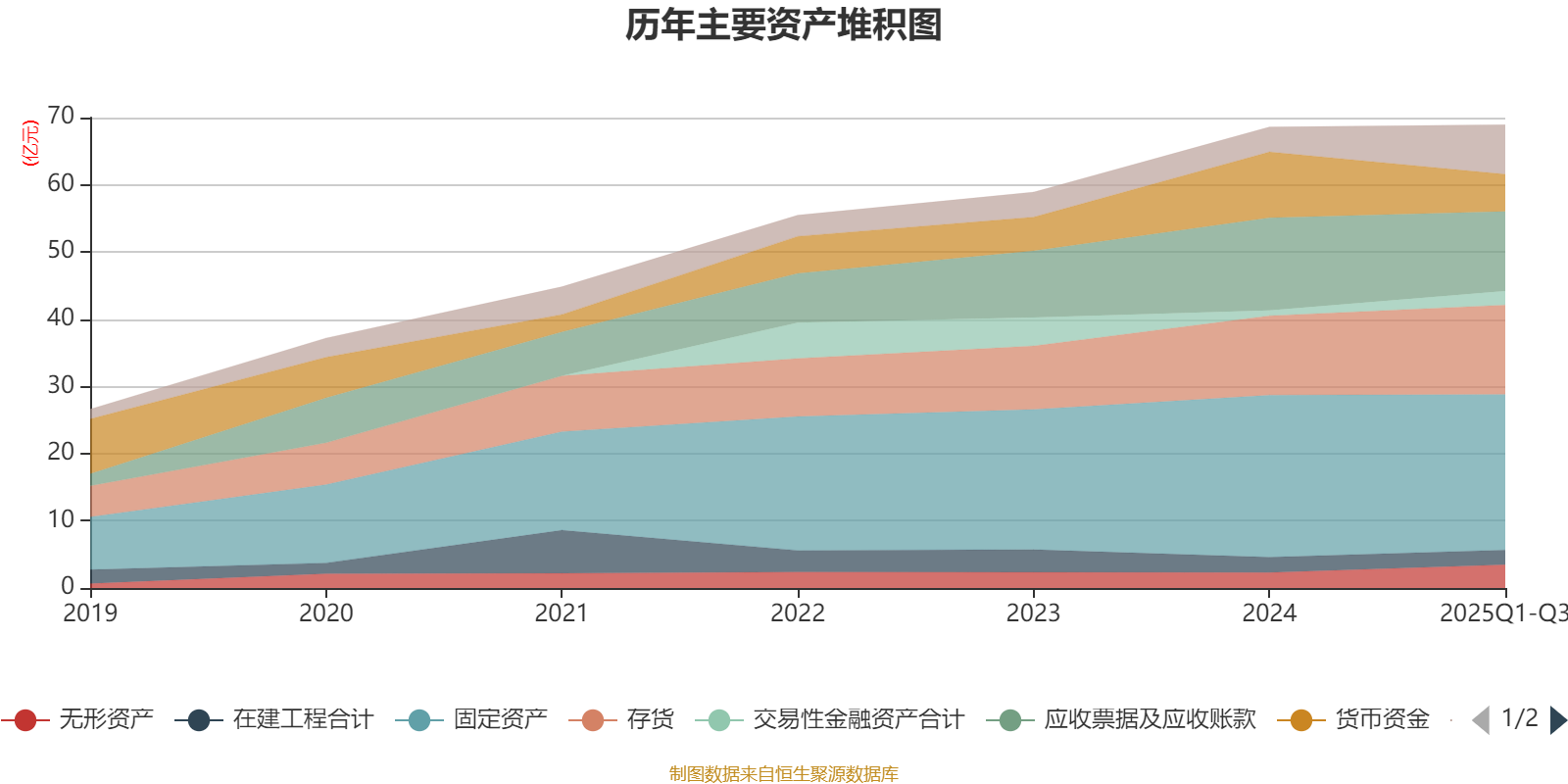 资产重大变化方面,截至2025年三季度末,公司货币资金较上年末减少43.52%,占公司总资产比重下降6.26个百分点;应收票据及应收账款较上年末减少14.01%,占公司总资产比重下降2.9个百分点;存货较上年末增加12.62%,占公司总资产比重上升2.08个百分点;交易性金融资产合计较上年末增加158.19%,占公司总资产比重上升1.83个百分点。