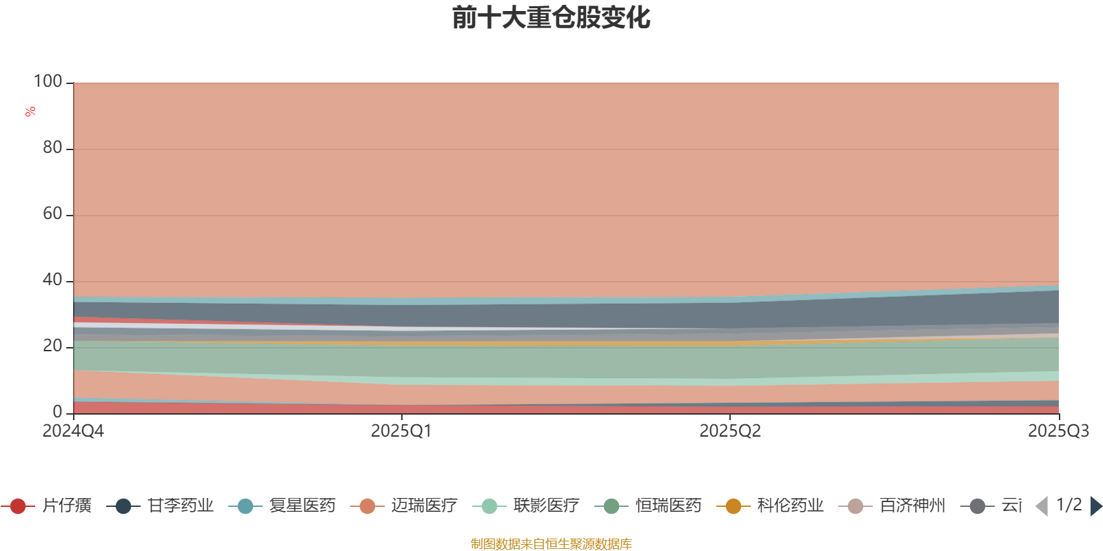 且持股标的较为稳定。截至2025年三季度末,基金十大重仓股分别是恒瑞医药、药明康德、迈瑞医疗、联影医疗、片仔癀、云南白药、甘李药业、爱尔眼科、百济神州、新和成。