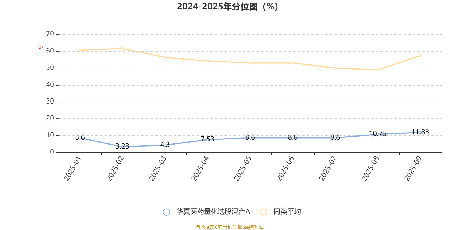 通过所选区间该基金净值增长率分位图,可以观察该基金与同类基金业绩比较情况。图为坐标原点到区间内某时点的净值增长率在同类基金中的分位数。