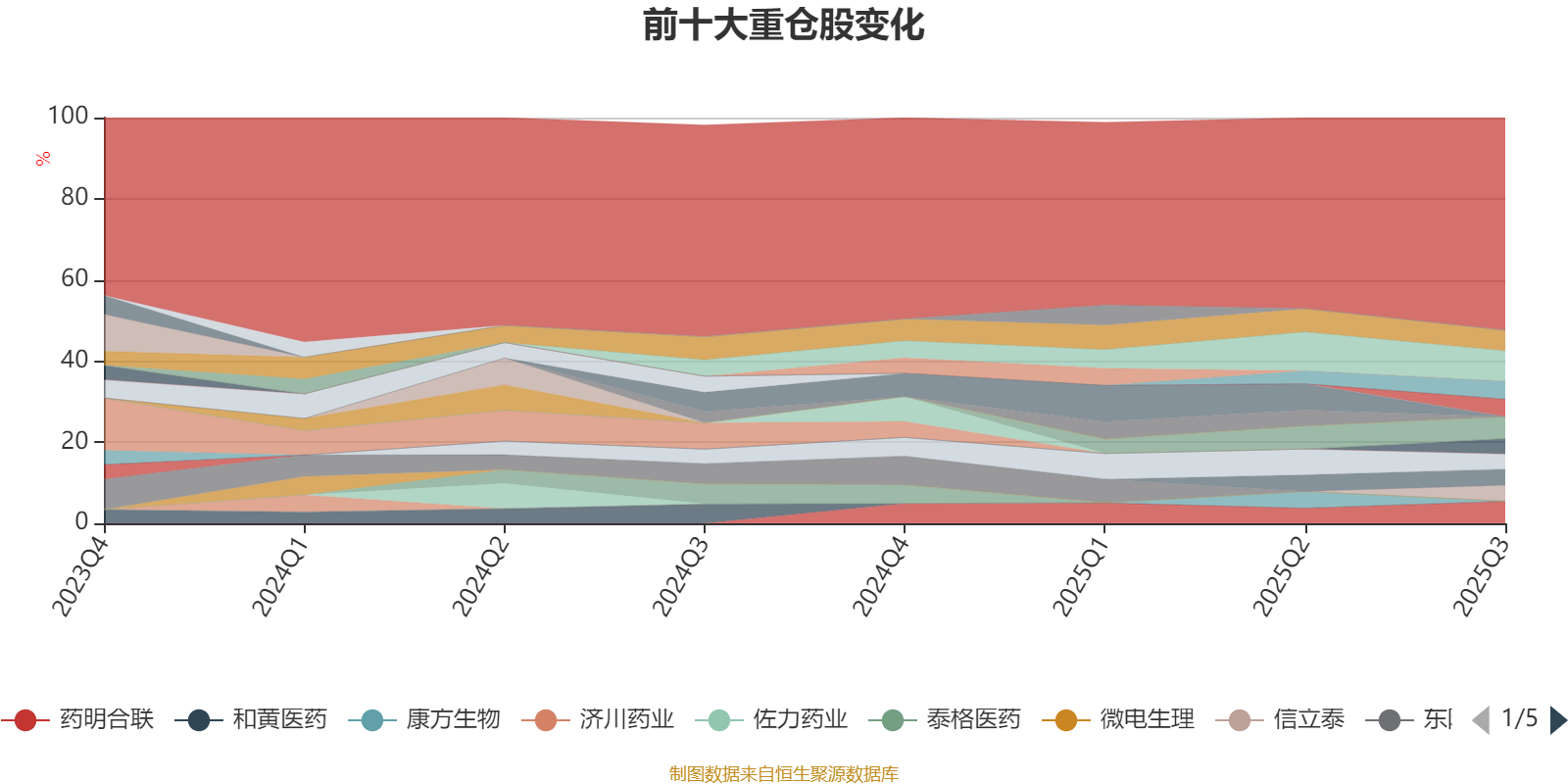 截至2025年三季度末,基金十大重仓股分别是信达生物、药明合联、三生制药、恒瑞医药、百利天恒、康诺亚-B、石药集团、信立泰、诺诚健华、泽璟制药。