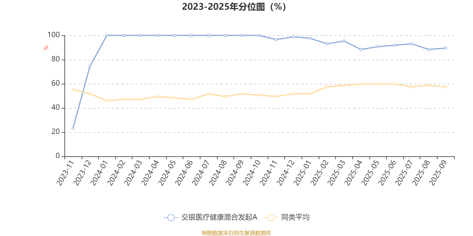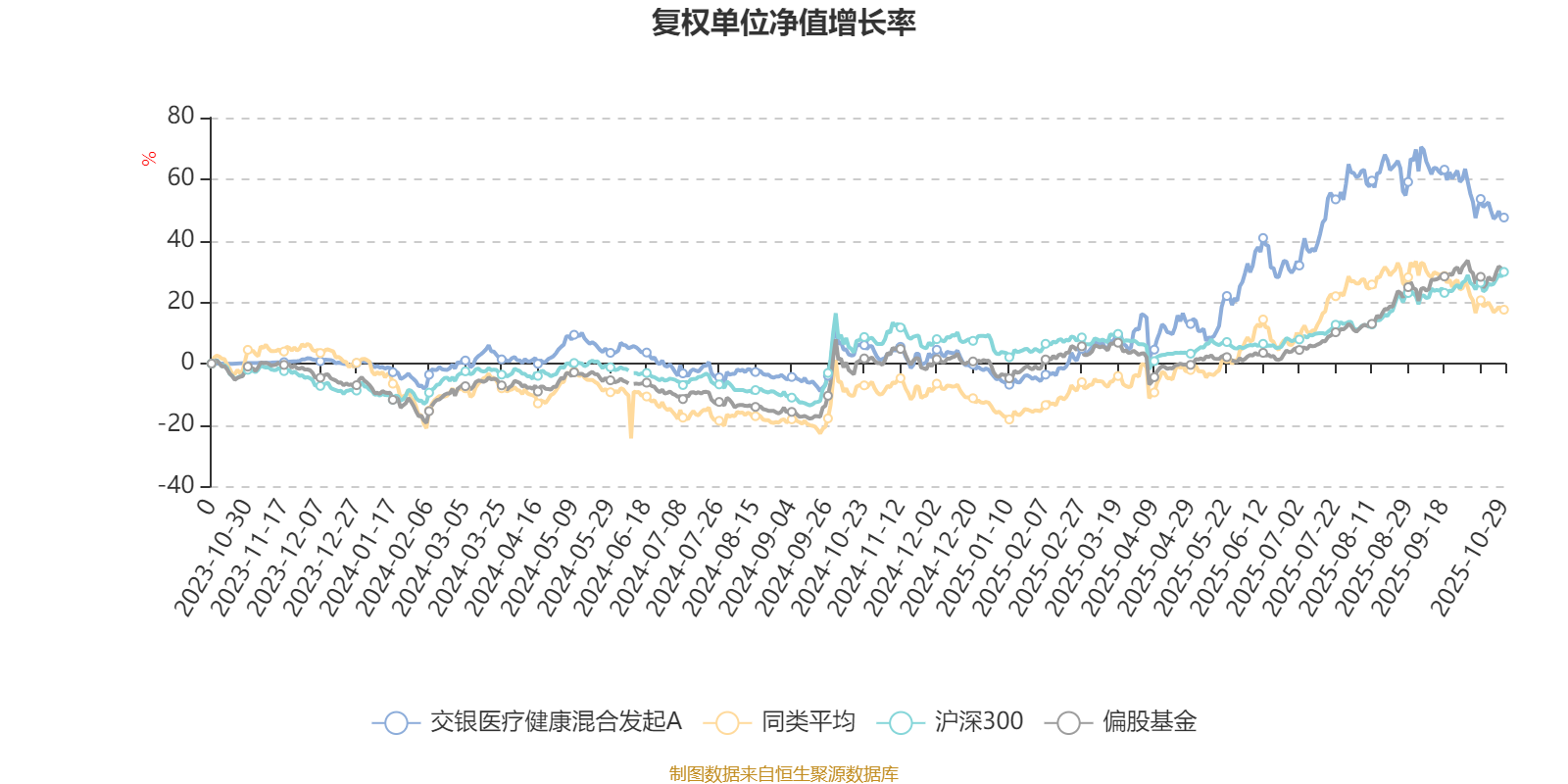 截至10月29日,交银医疗健康混合发起A近三个月复权单位净值增长率为-10.53%,位于同类可比基金66/106;近半年复权单位净值增长率为30.67%,位于同类可比基金20/104;近一年复权单位净值增长率为42.16%,位于同类可比基金21/101。