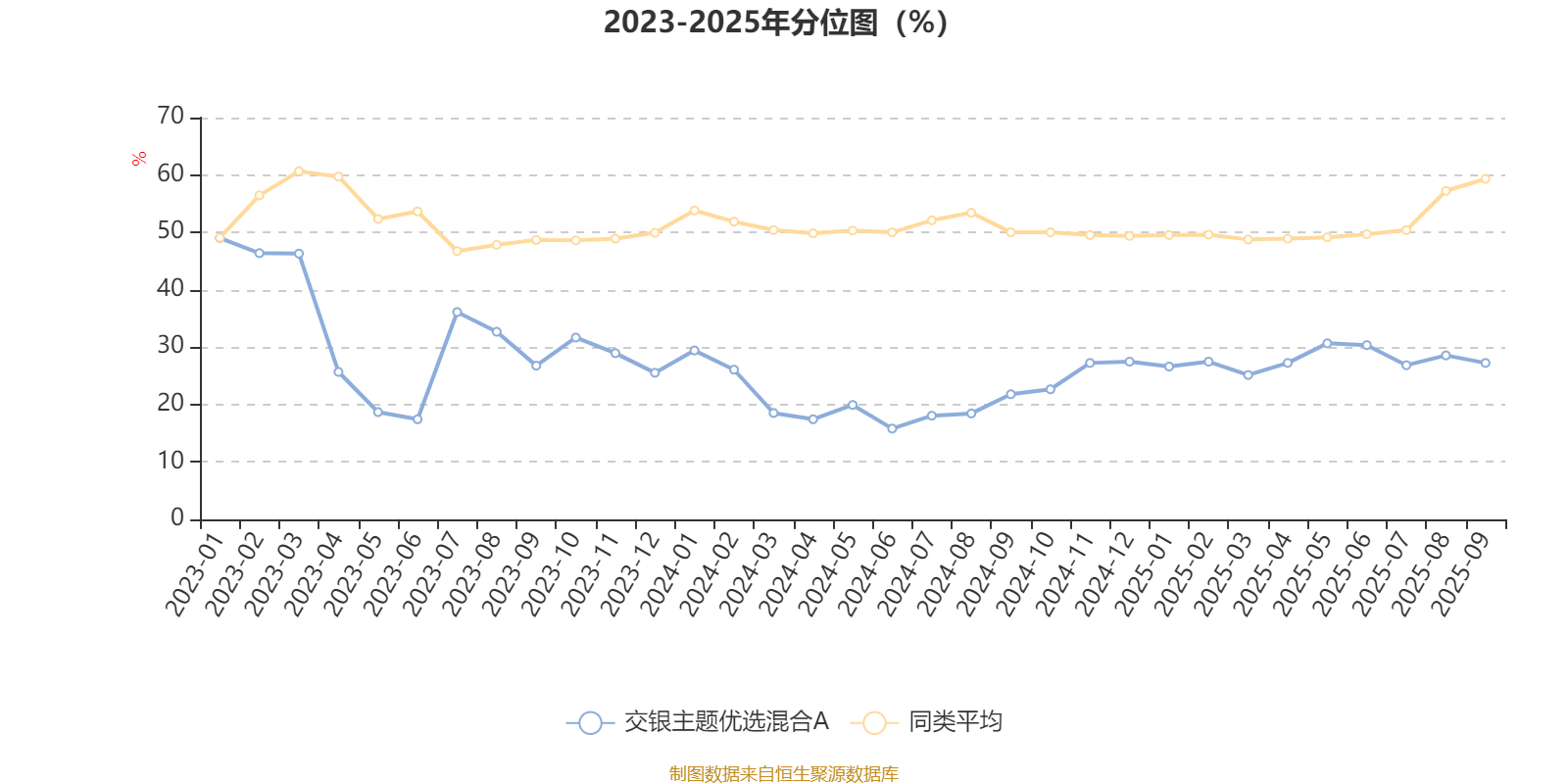 通过所选区间该基金净值增长率分位图,可以观察该基金与同类基金业绩比较情况。图为坐标原点到区间内某时点的净值增长率在同类基金中的分位数。