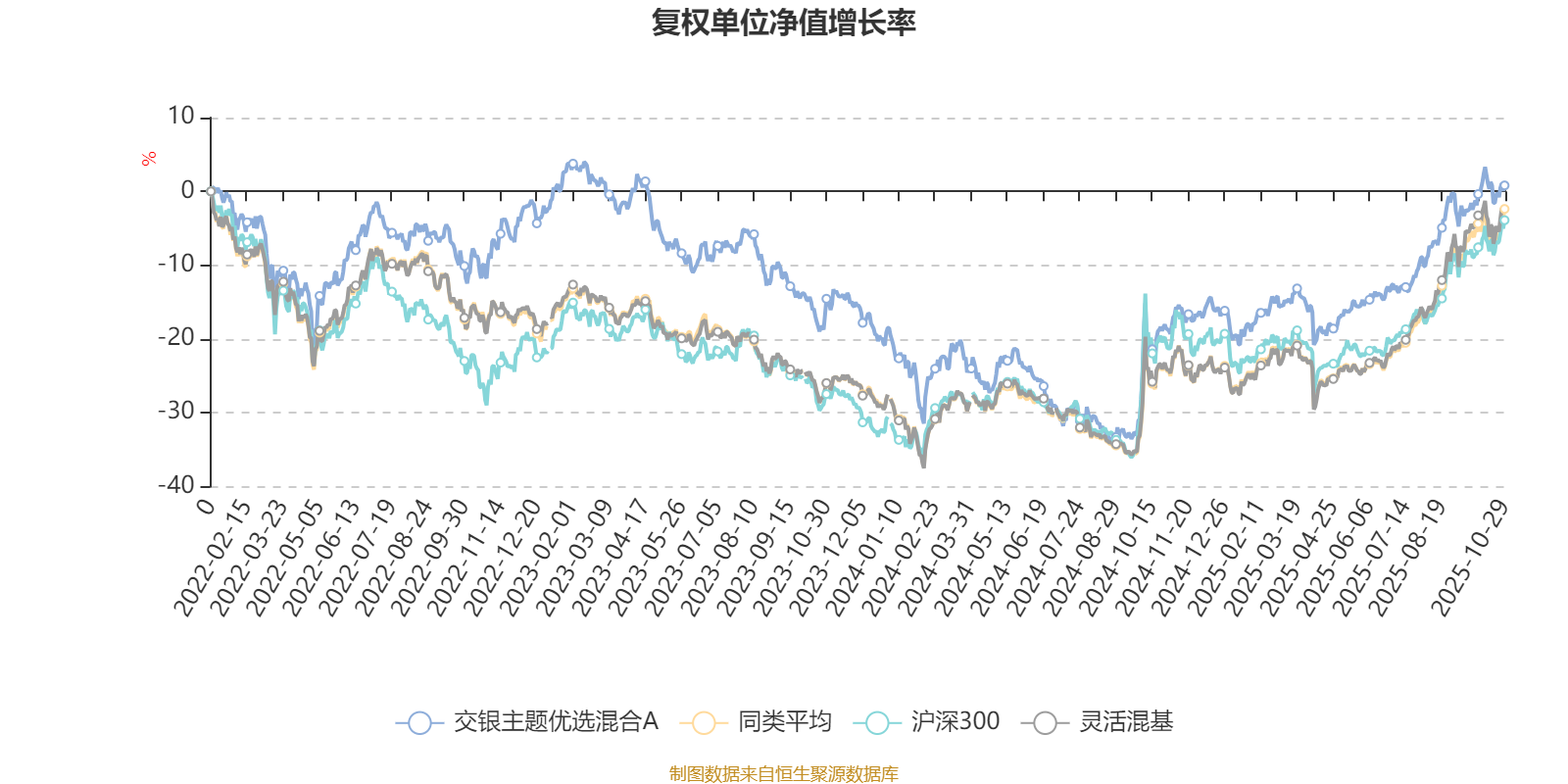 截至10月29日,交银主题优选混合A近三个月复权单位净值增长率为10.68%,位于同类可比基金710/1287;近半年复权单位净值增长率为24.02%,位于同类可比基金667/1287;近一年复权单位净值增长率为23.83%,位于同类可比基金643/1287;近三年复权单位净值增长率为13.94%,位于同类可比基金725/1286。