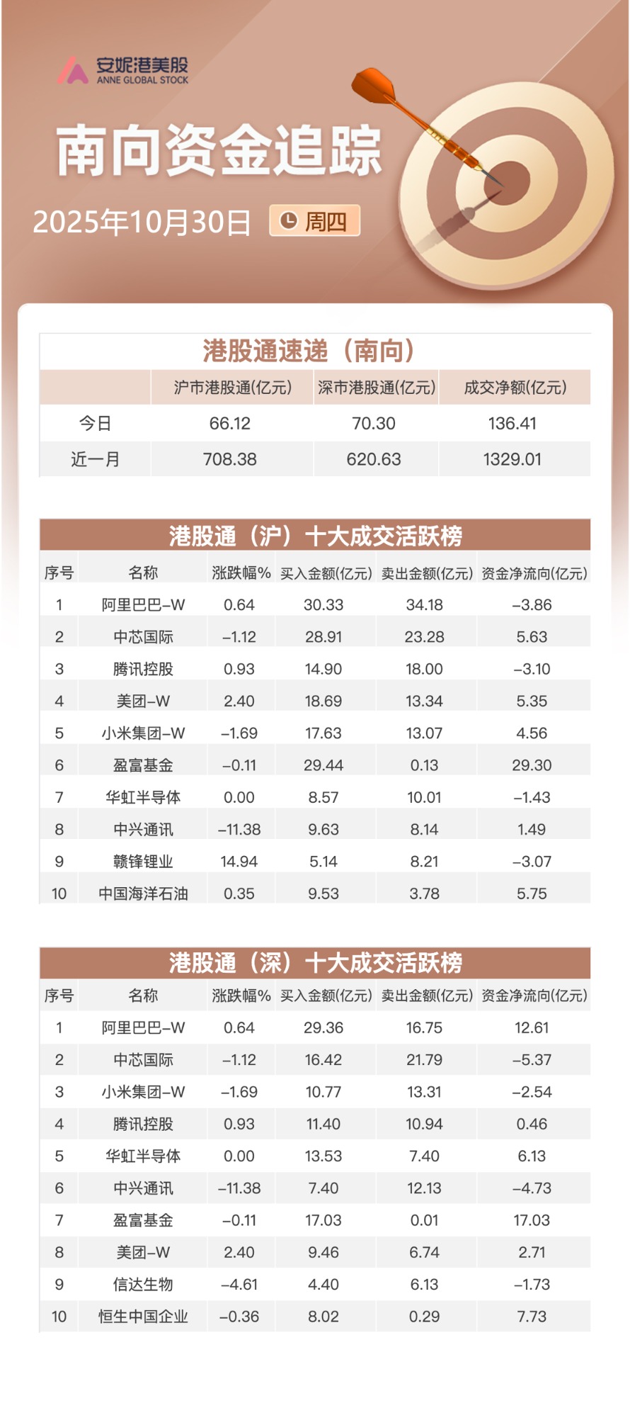 原标题:南向资金追踪|净买入超136亿港元 加仓两大ETF和阿里减持中兴通讯