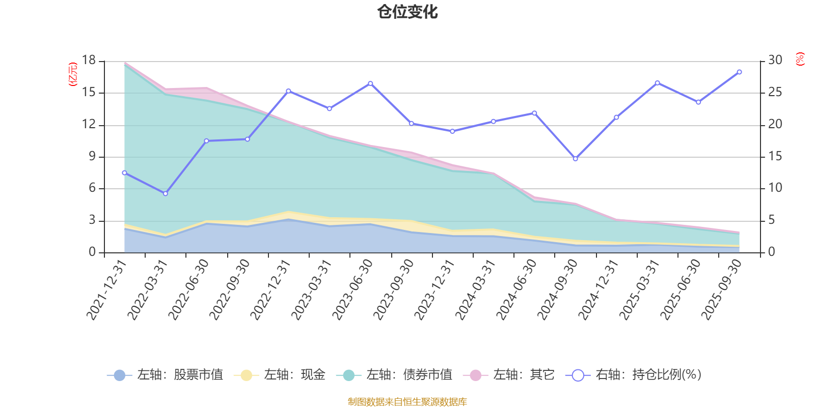 据定期报告数据统计,近三年平均股票仓位为22.53%,同类平均为19.14%。2025年三季度末基金达到28.29%的最高仓位,2022年一季度末最低,为9.24%。