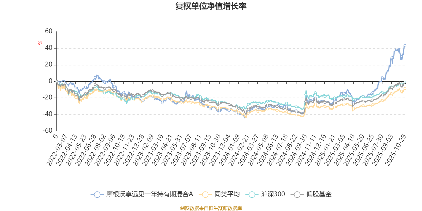 截至10月29日,摩根沃享远见一年持有期混合A近三个月复权单位净值增长率为35.93%,位于同类可比基金19/265;近半年复权单位净值增长率为85.04%,位于同类可比基金5/265;近一年复权单位净值增长率为86.12%,位于同类可比基金6/265;近三年复权单位净值增长率为78.28%,位于同类可比基金9/253。