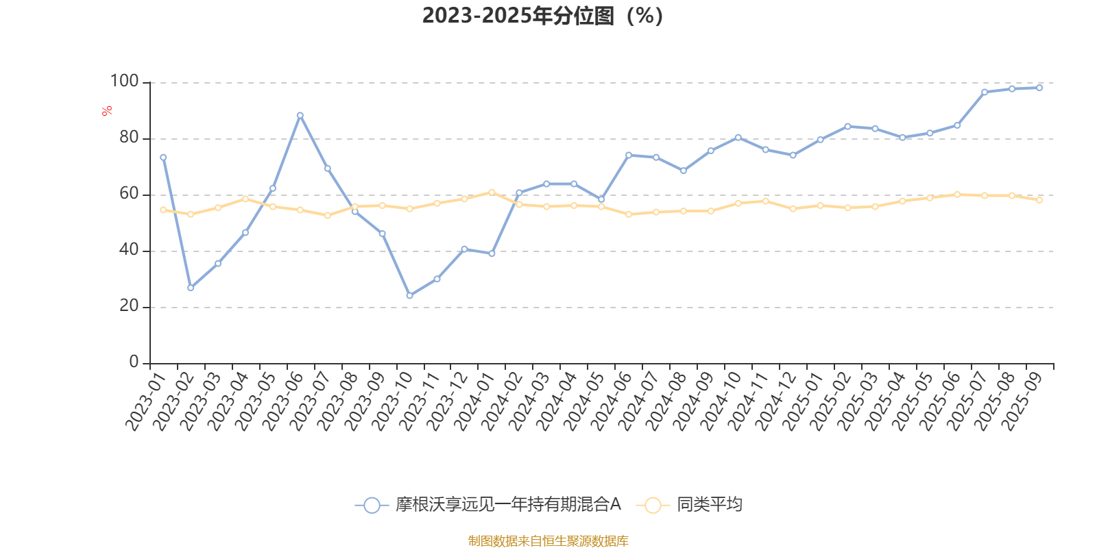 通过所选区间该基金净值增长率分位图,可以观察该基金与同类基金业绩比较情况。图为坐标原点到区间内某时点的净值增长率在同类基金中的分位数。