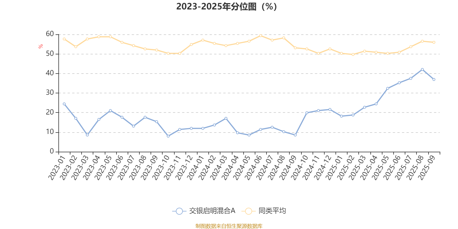 通过所选区间该基金净值增长率分位图,可以观察该基金与同类基金业绩比较情况。图为坐标原点到区间内某时点的净值增长率在同类基金中的分位数。