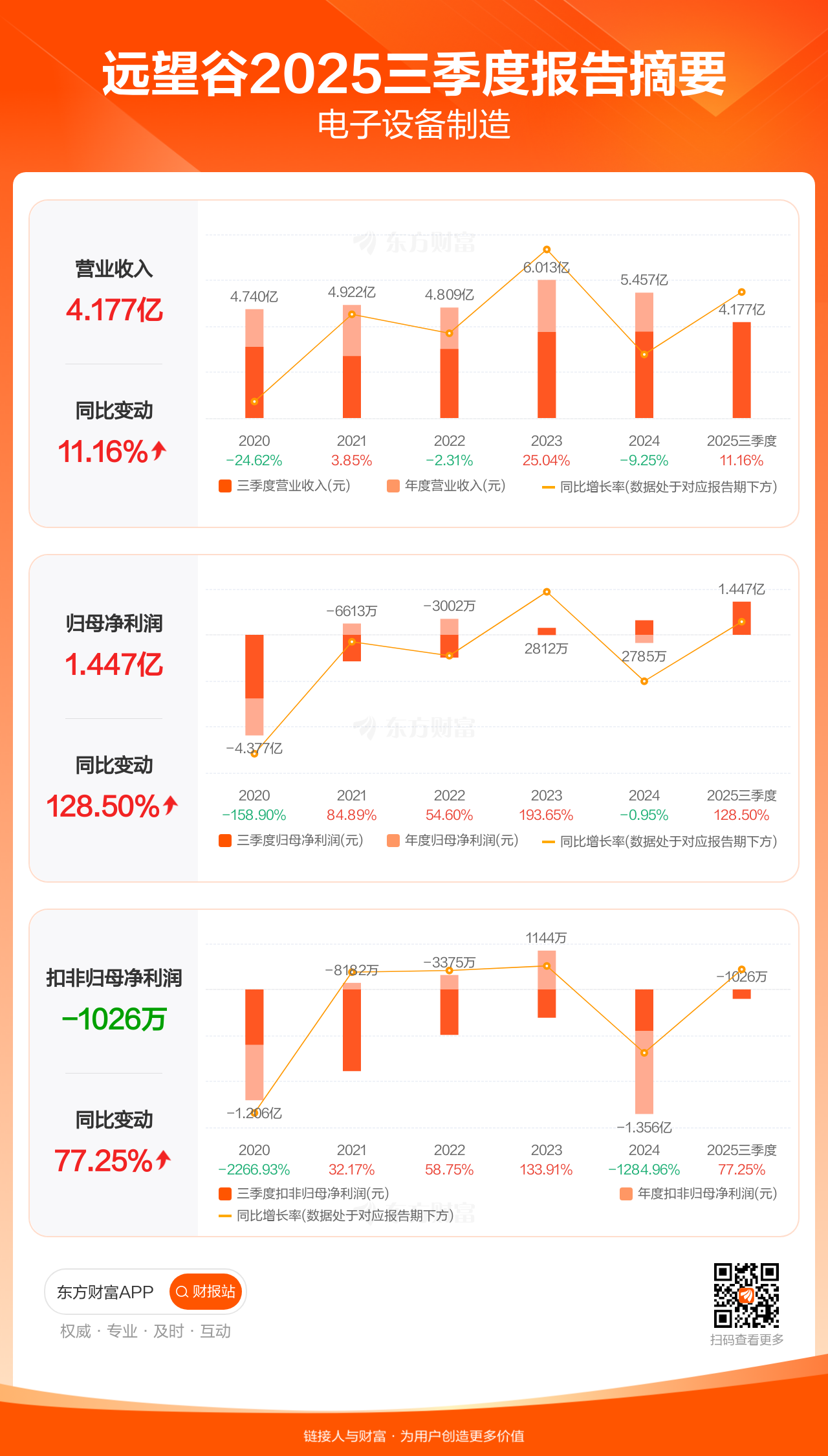 远望谷10月31日发布2025年三季报显示,公司前三季实现营业收入4.18亿元,同比增长11.16%;归母净利润1.45亿元,同比增长128.50%;扣非归母净利润-1026.07万元。