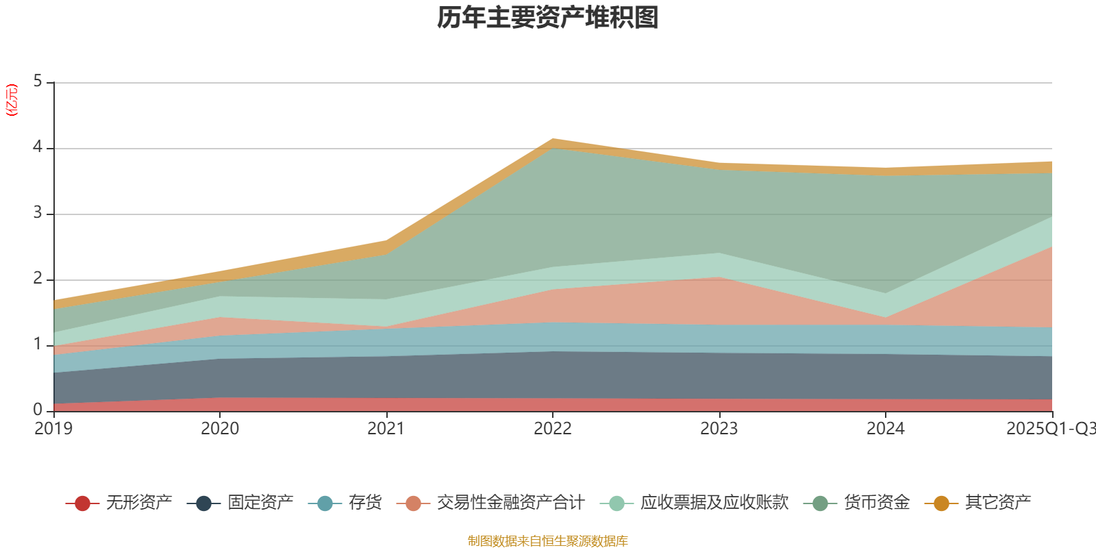 资产重大变化方面,截至2025年三季度末,公司货币资金较上年末减少62.97%,占公司总资产比重下降30.87个百分点;交易性金融资产合计较上年末增加1018.18%,占公司总资产比重上升29.44个百分点;应收票据及应收账款较上年末增加23.15%,占公司总资产比重上升2个百分点;固定资产较上年末减少4.52%,占公司总资产比重下降1.29个百分点。