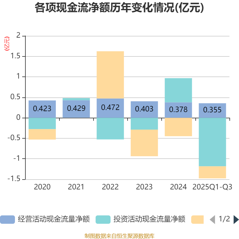 2025年前三季度,公司经营活动现金流净额为3548.89万元,同比增长68.57%;筹资活动现金流净额-2940.07万元,同比增加1658.01万元;投资活动现金流净额-1.18亿元,上年同期为-5179.24万元。