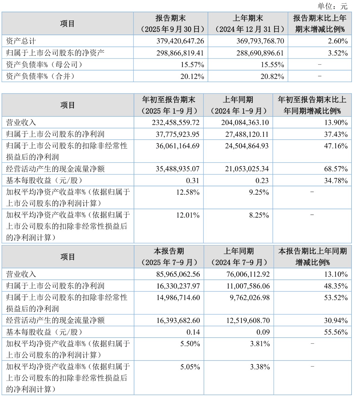 中证智能财讯三维装备(920834)10月30日披露2025年第三季度报告。前三季度公司实现营业总收入2.32亿元,同比增长13.90%;归母净利润3777.59万元,同比增长37.43%;扣非净利润3606.12万元,同比增长47.16%;经营活动产生的现金流量净额为3548.89万元,同比增长68.57%;报告期内,三维装备基本每股收益为0.31元,加权平均净资产收益率为12.58%。