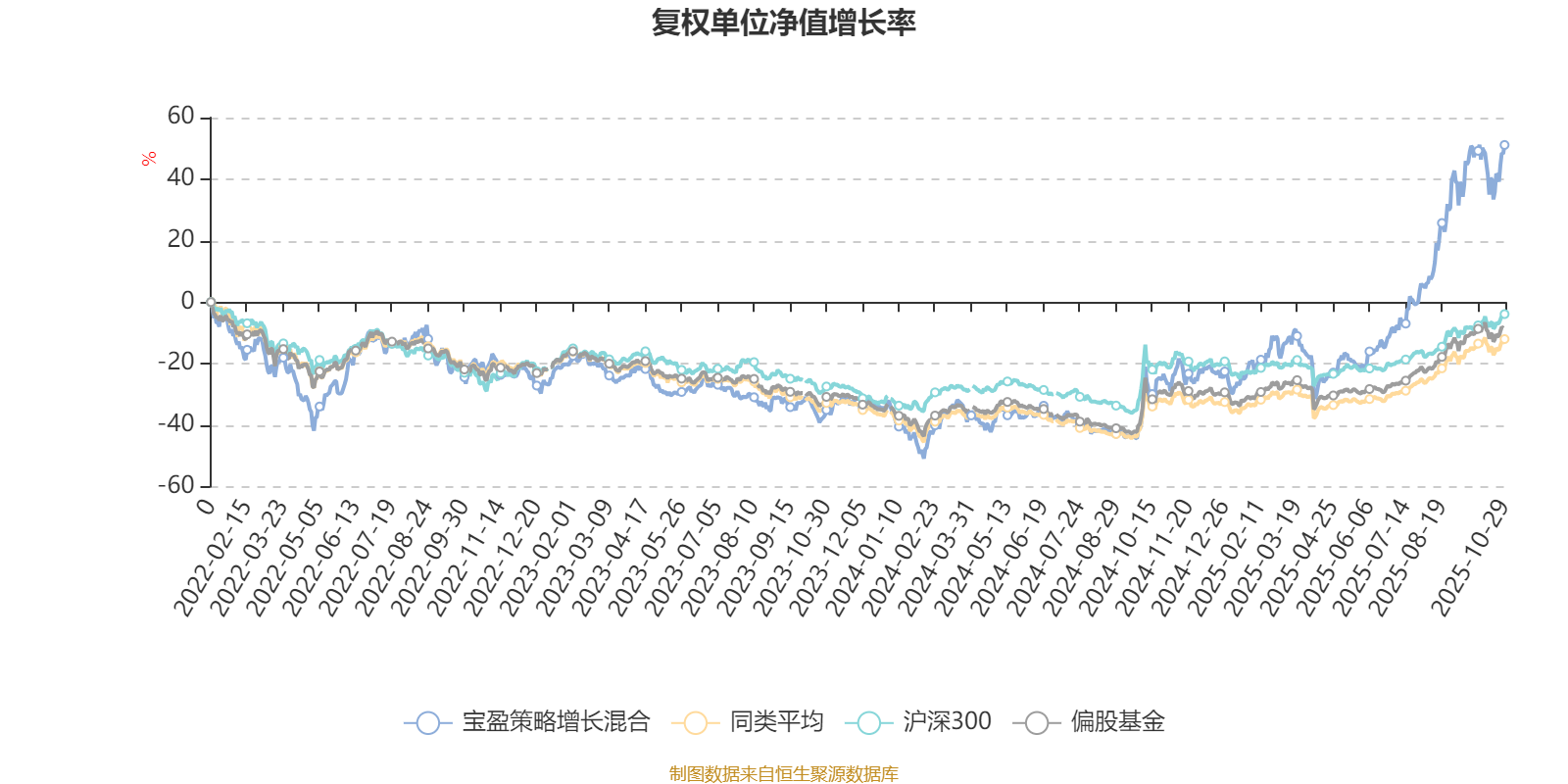 截至10月29日,宝盈策略增长混合近三个月复权单位净值增长率为42.48%,位于同类可比基金8/185;近半年复权单位净值增长率为95.70%,位于同类可比基金1/185;近一年复权单位净值增长率为103.48%,位于同类可比基金2/181;近三年复权单位净值增长率为99.42%,位于同类可比基金4/175。
