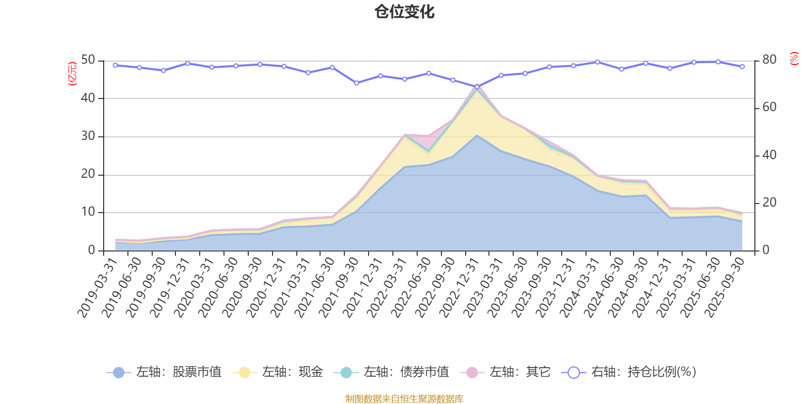 据定期报告数据统计,近三年平均股票仓位为76.68%,同类平均为72.35%。2025年上半年末基金达到79.48%的最高仓位,2022年末最低,为68.92%。
