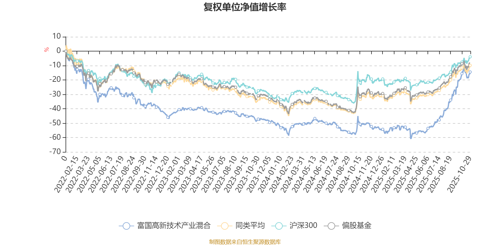 截至10月29日,富国高新技术产业混合近三个月复权单位净值增长率为45.68%,位于同类可比基金7/265;近半年复权单位净值增长率为97.47%,位于同类可比基金3/265;近一年复权单位净值增长率为74.40%,位于同类可比基金10/265;近三年复权单位净值增长率为38.46%,位于同类可比基金61/253。