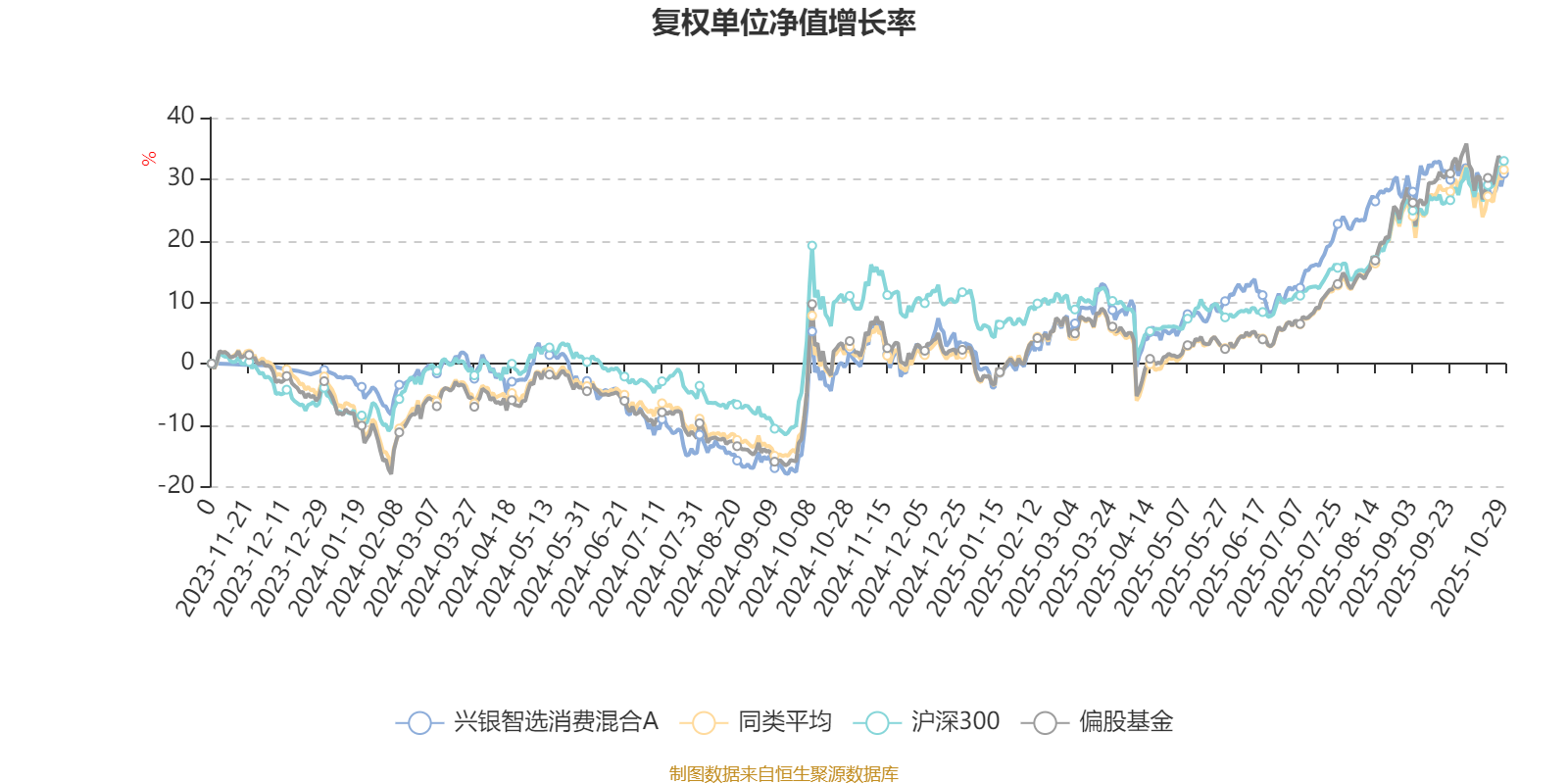 截至10月29日,兴银智选消费混合A近三个月复权单位净值增长率为5.63%,位于同类可比基金550/689;近半年复权单位净值增长率为24.10%,位于同类可比基金420/688;近一年复权单位净值增长率为29.59%,位于同类可比基金310/657。