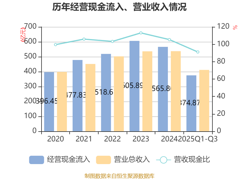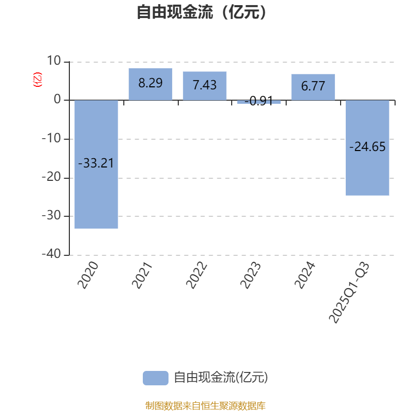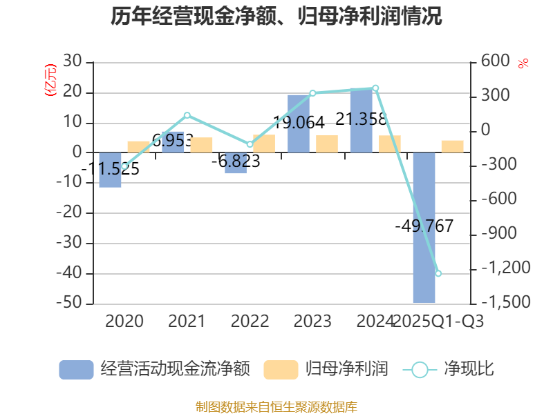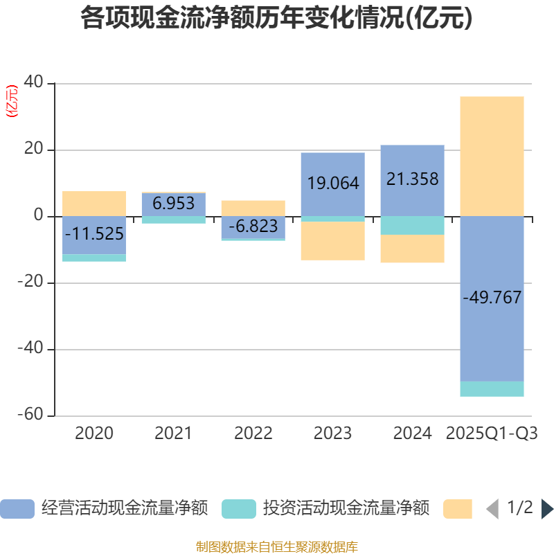 2025年前三季度,公司经营活动现金流净额为-49.77亿元,同比减少20.83亿元;筹资活动现金流净额35.97亿元,同比增加15.97亿元;投资活动现金流净额-4.56亿元,上年同期为-4.97亿元。